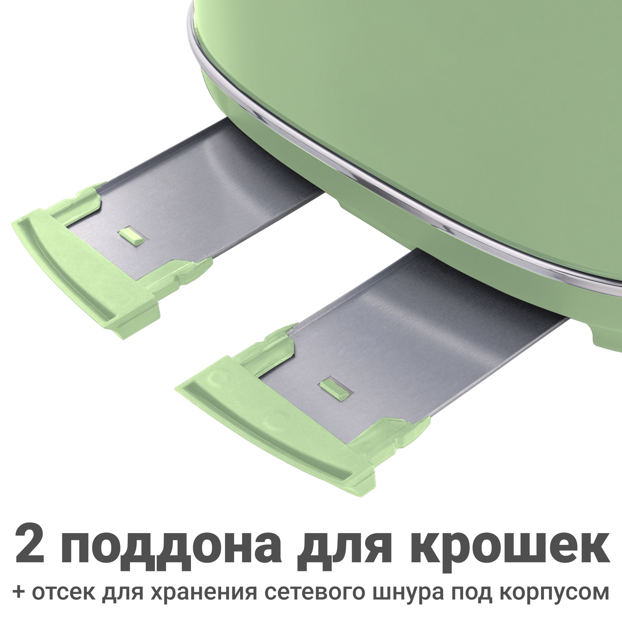 Засорение внутренних поверхностей часто приводит к перегреву. Поэтому в тостере TT-445 предусмотрено два выдвижных поддона для крошек, которые избавят вас от необходимости чистить тостер.