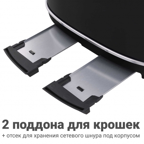 Засорение внутренних поверхностей часто приводит к перегреву. Поэтому в тостере TT-445 предусмотрено два выдвижных поддона для крошек, которые избавят вас от необходимости чистить тостер.