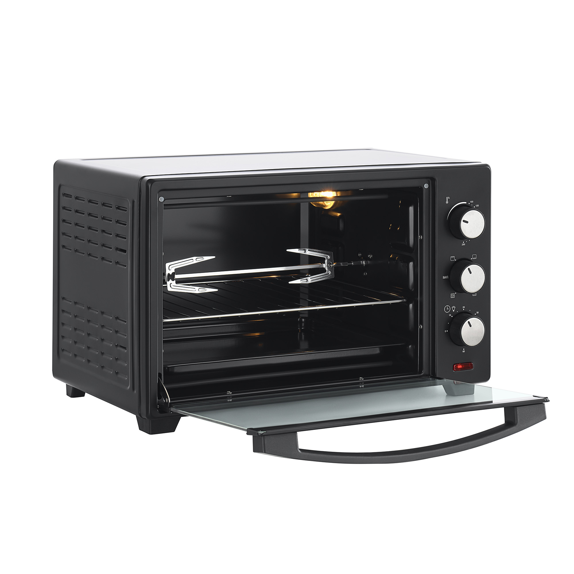 Мини-печь поставляется с поддоном и ручкой для его безопасного извлечения, металлической решеткой, а также с вертелом и держателем для вертела.