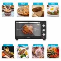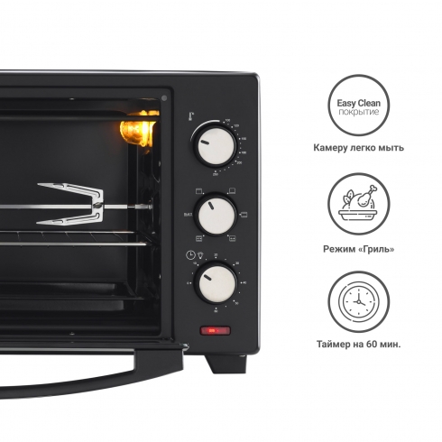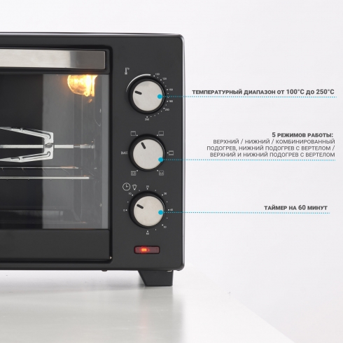 Механическое управление с большими удобными переключателями гарантирует легкость в управлении прибором. Вы просто выбираете один из 5 режимов работы, температуру (до 250 градусов), а также время приготовления (до 60 минут). По истечении установленного срока печь оповестит вас звуковым сигналом.