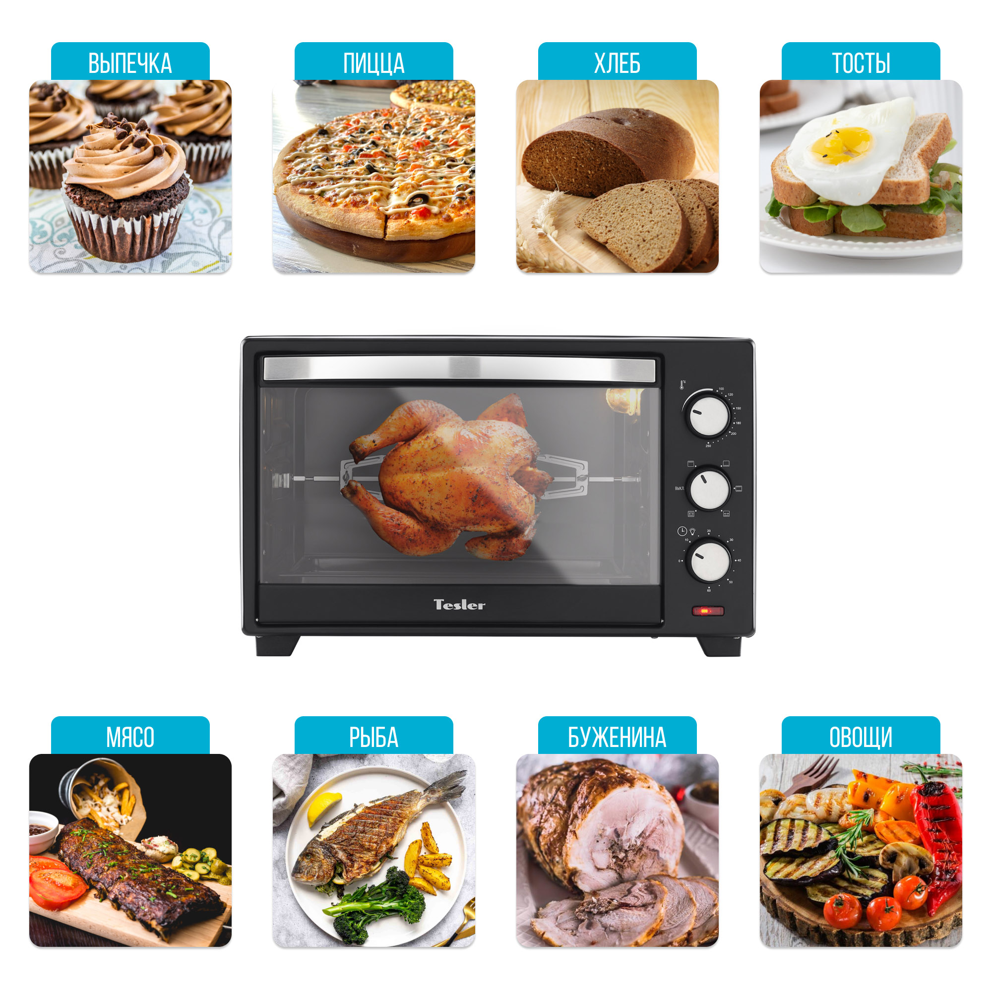 Важная особенность всех моделей мини-печей Tesler - наличие вертела. Это позволяет приготовить блюда из мяса, рыбы, птицы и овощей, обеспечивая ровное запекание и поджаренную хрустящую корочку со всех сторон.