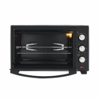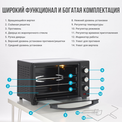 Мини-печь поставляется с противнем, металлической решеткой и ручкой для её безопасного извлечения, а также с вертелом и держателем для вертела.