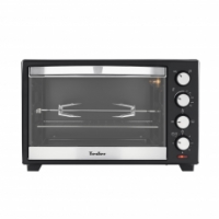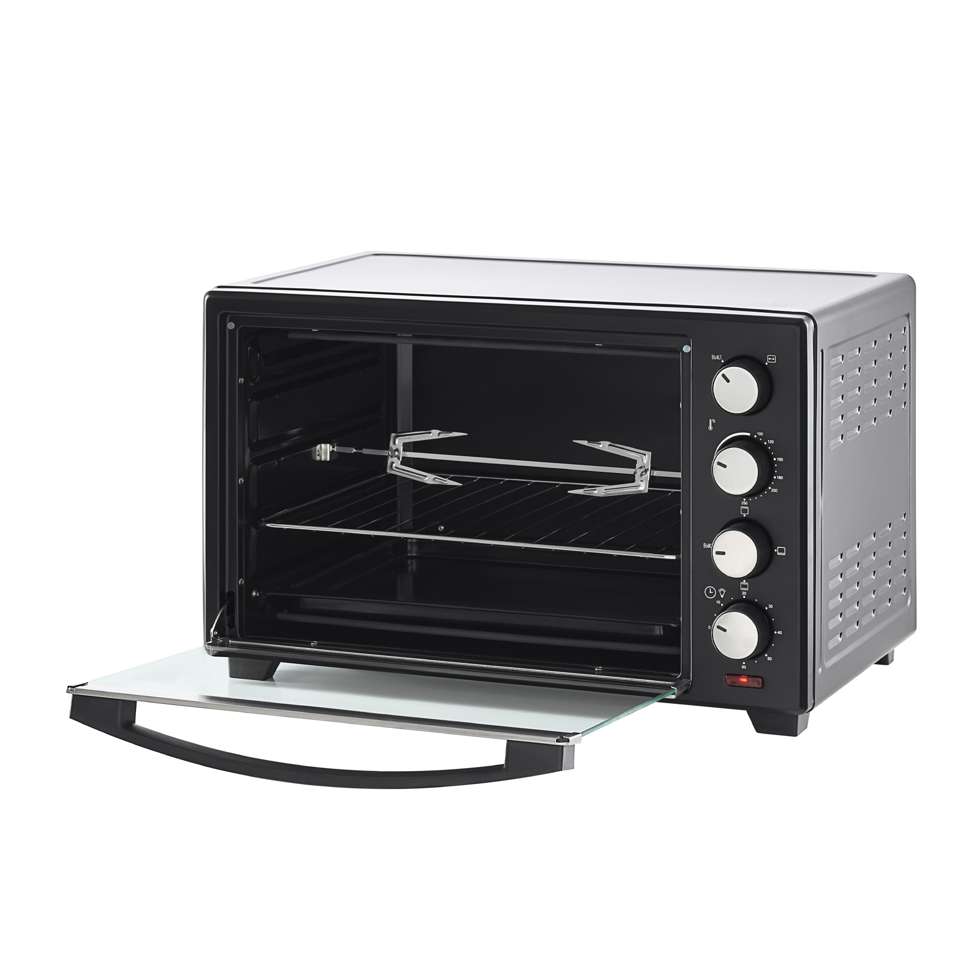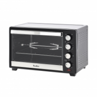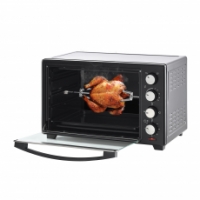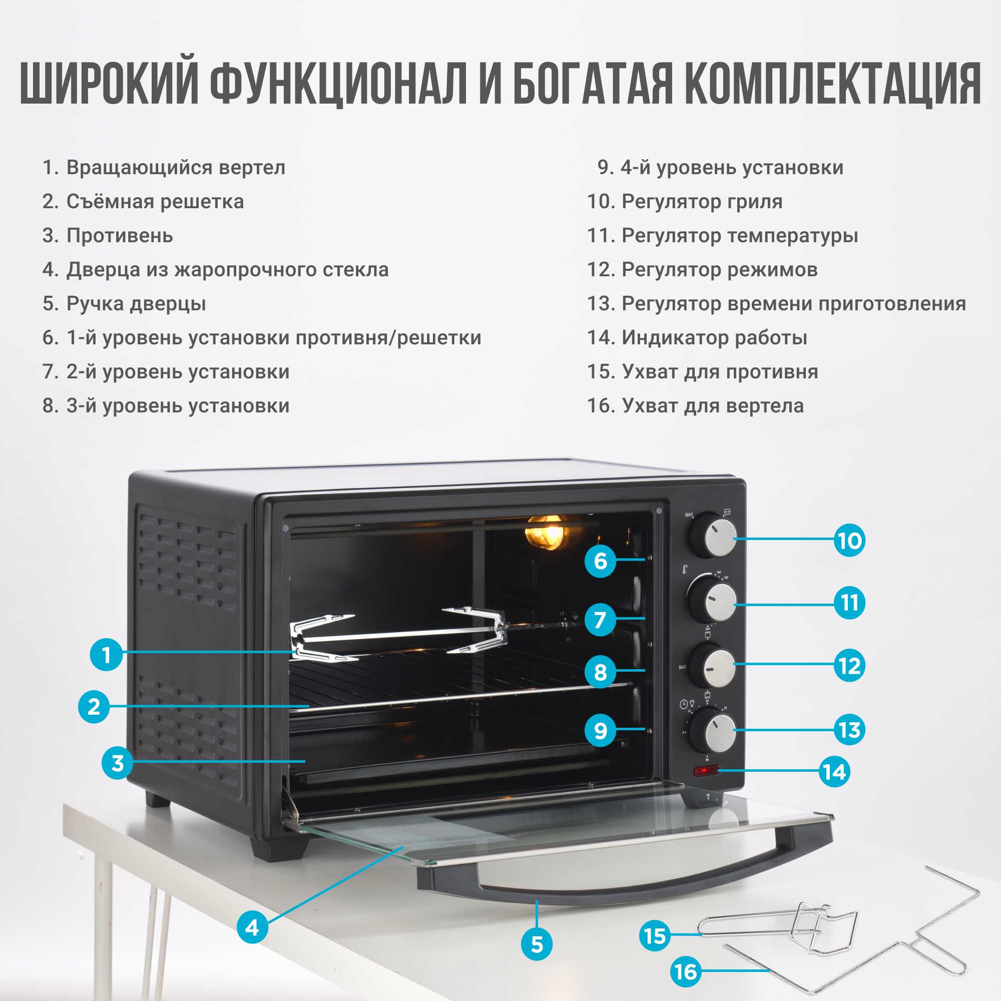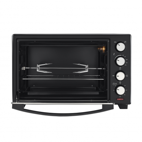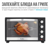Мини-печь поставляется с противнем, металлической решеткой и ручкой для её безопасного извлечения, а также с вертелом и держателем для вертела.