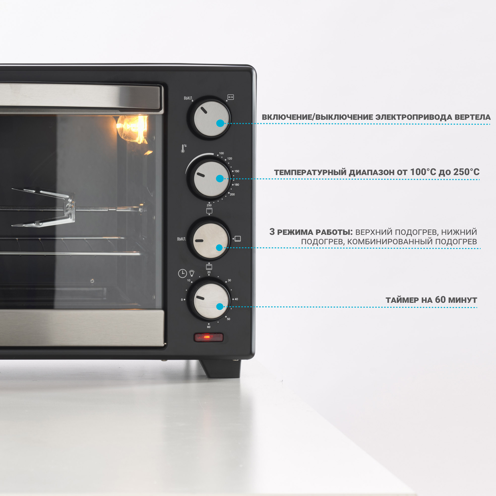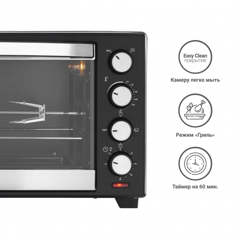 Механическое управление с большими удобными переключателями гарантирует легкость в управлении прибором. Вы просто выбираете один из 6 режимов работы, температуру (до 250 градусов), а также время приготовления (до 60 минут). По истечении установленного срока печь оповестит вас звуковым сигналом.