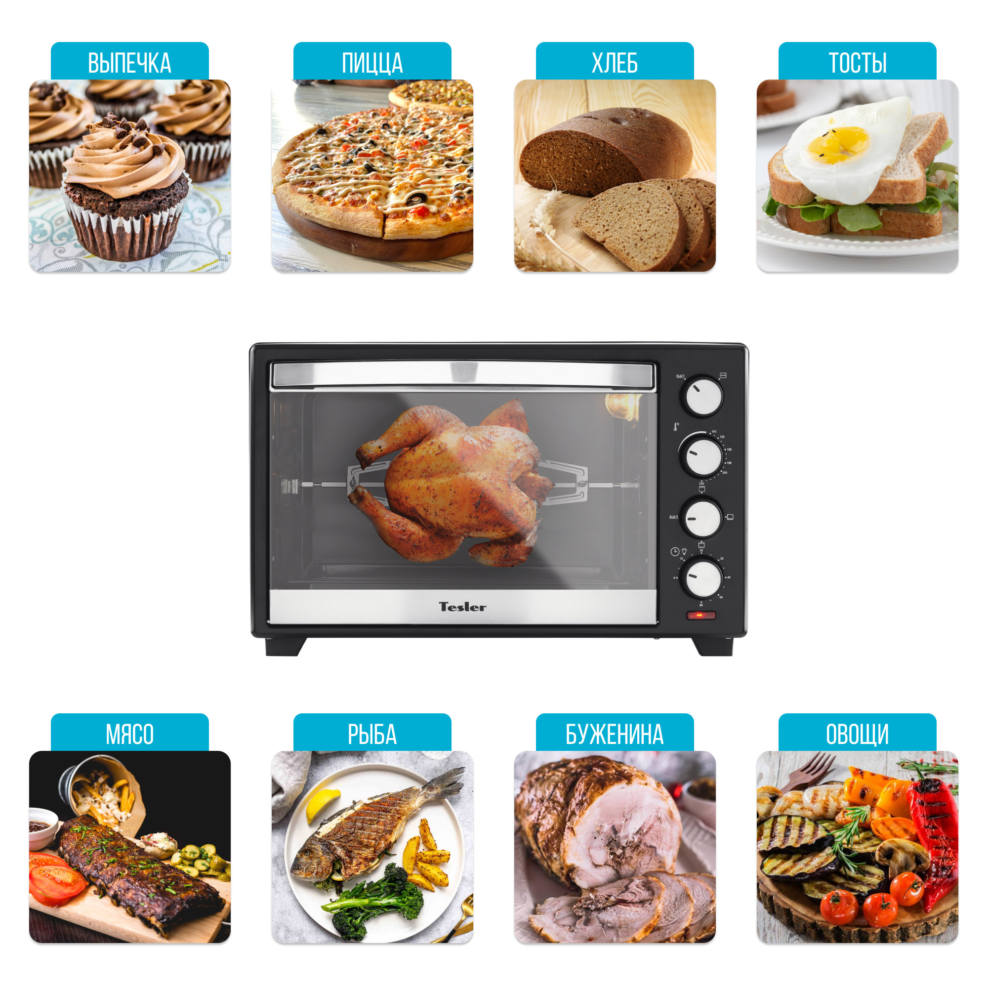 Важная особенность всех моделей мини-печей Tesler — наличие вертела. Это позволяет приготовить блюда из мяса, рыбы, птицы и овощей, обеспечивая ровное запекание и поджаренную хрустящую корочку со всех сторон.