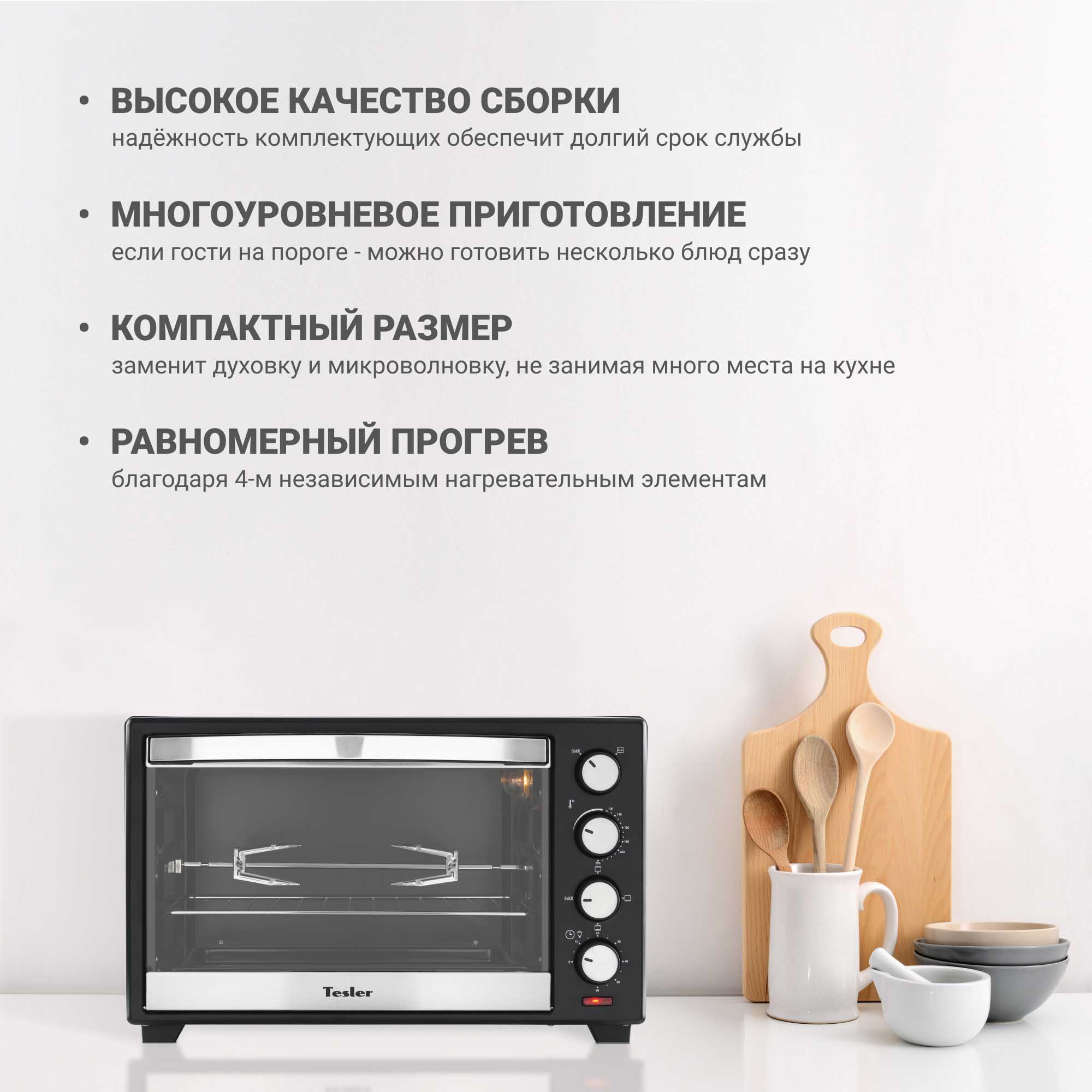 Мини-печь Tesler EOG-3800 - современная кухонная техника, с помощью которой можно быстро приготовить вкусную и разнообразную еду.