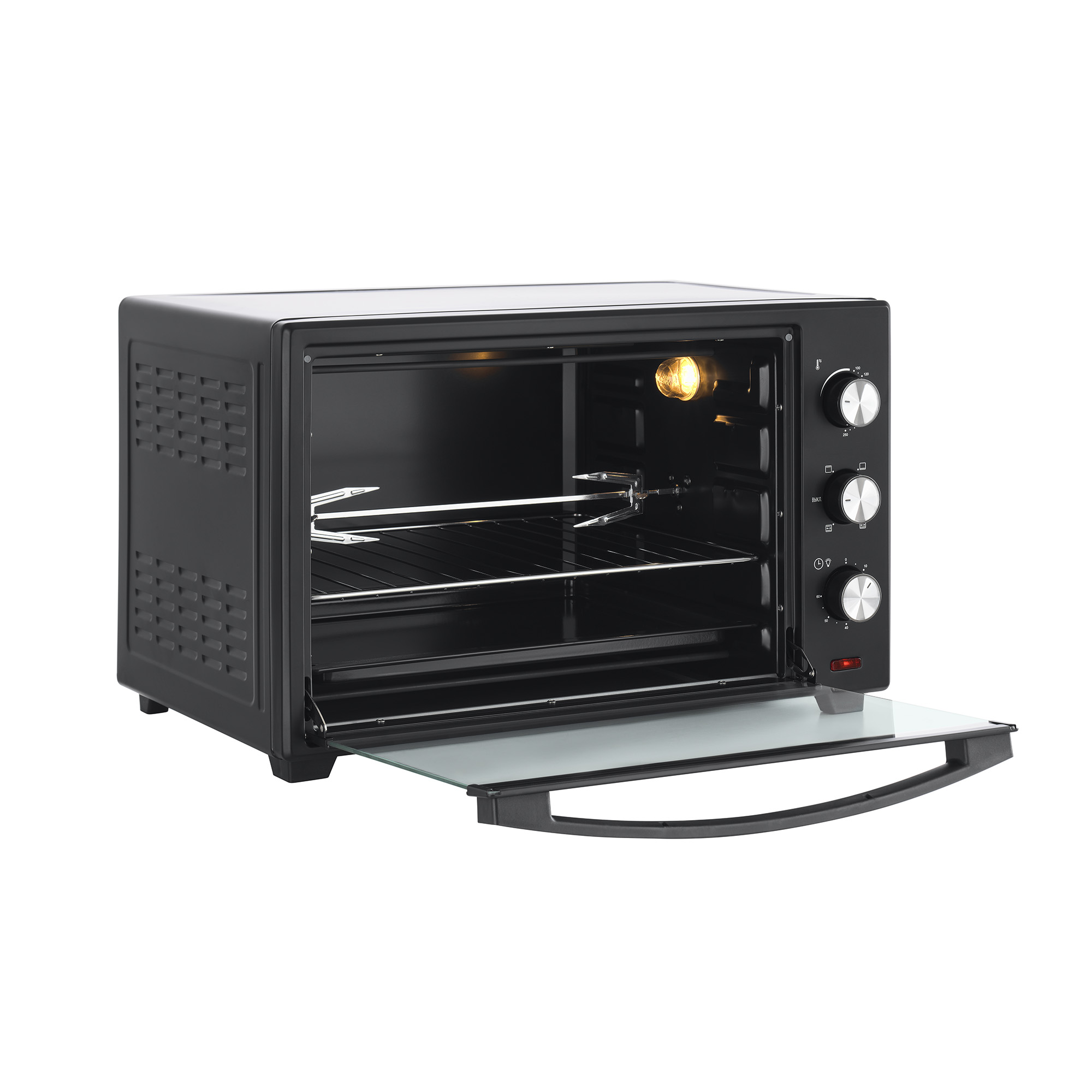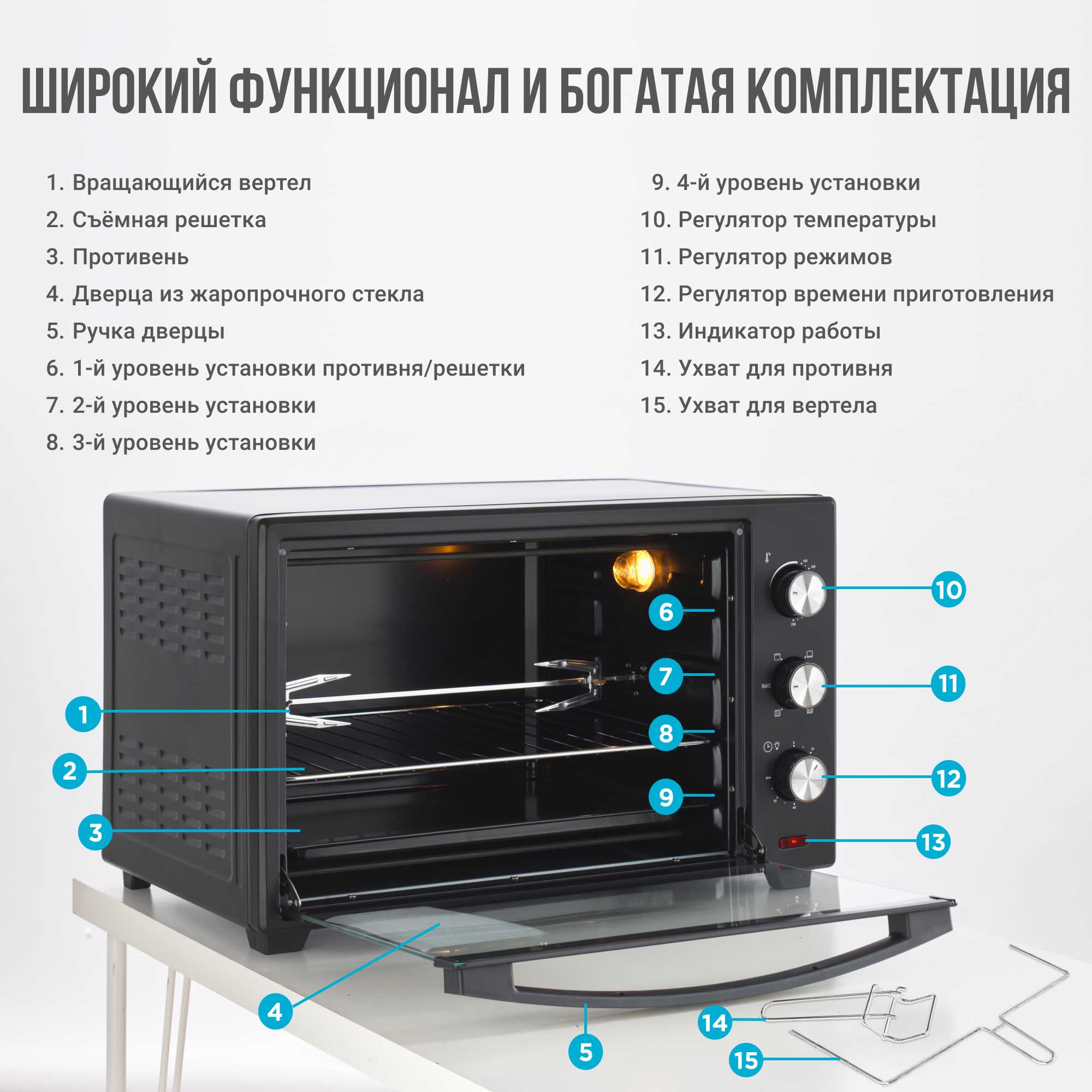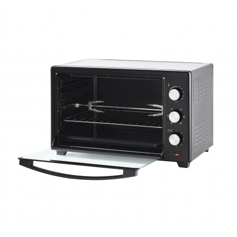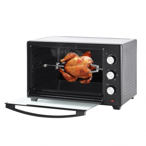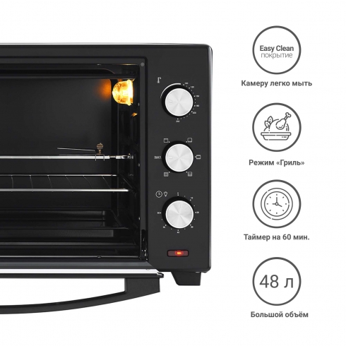 Мини-печь поставляется с противнем, металлической решеткой и ручкой для её безопасного извлечения, а также с вертелом и держателем для вертела.