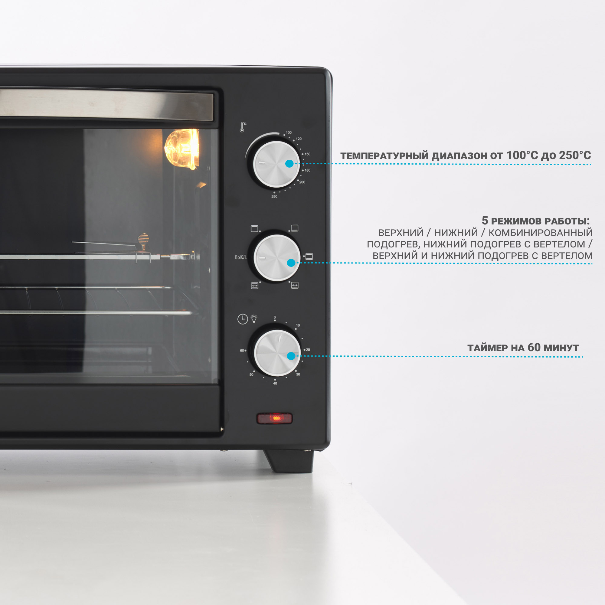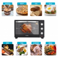 Механическое управление с большими удобными переключателями гарантирует легкость в управлении прибором. Вы просто выбираете один из 5 режимов работы, температуру (до 250 градусов), а также время приготовления (до 60 минут). По истечении установленного срока печь оповестит вас звуковым сигналом.