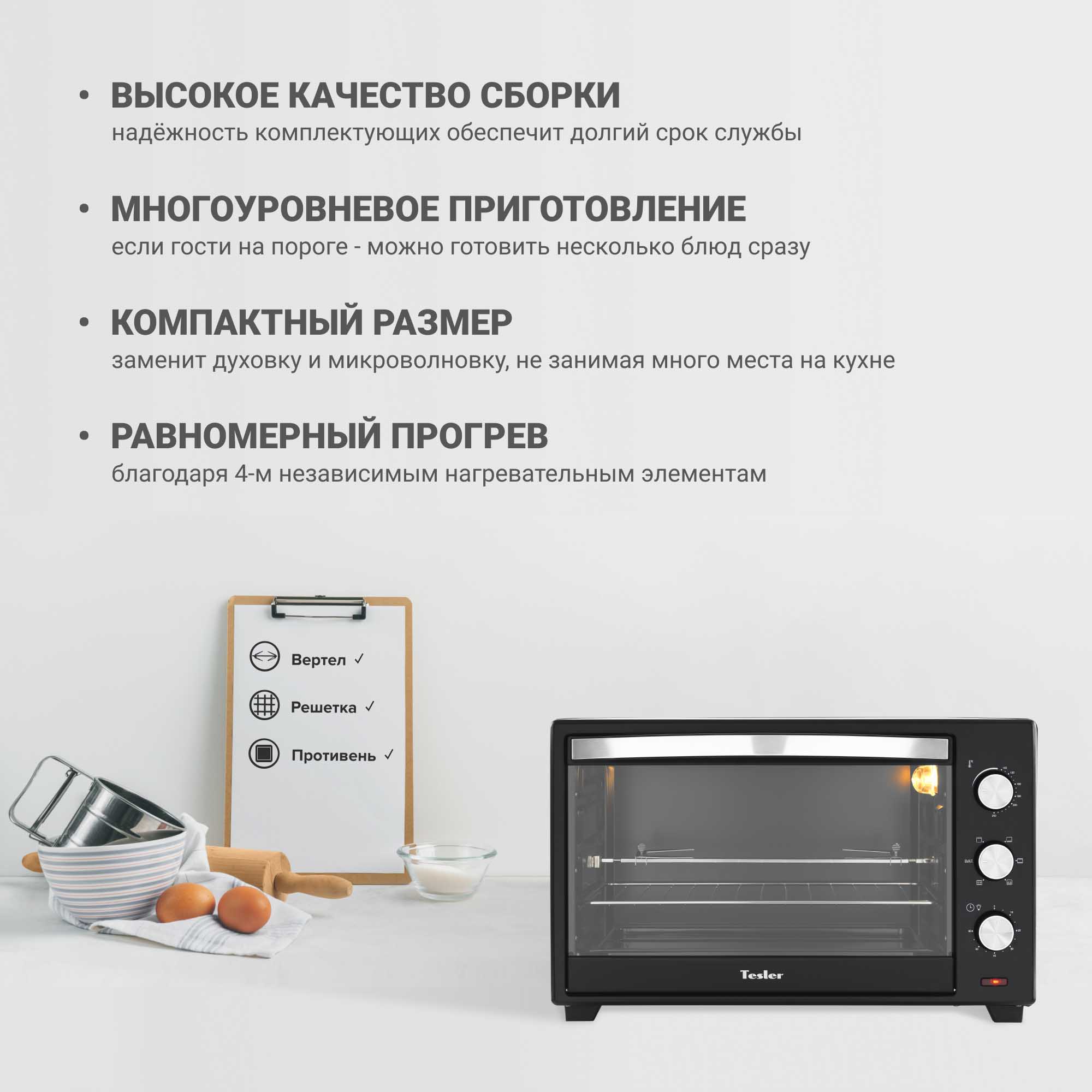 Быстро приготовить картофель или курицу до румяной корочки, или испечь потрясающий торт теперь не проблема – мини-печь Tesler EOG-4800 в стильном корпусе черного цвета готова на любые гастрономические эксперименты!