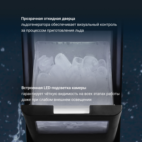 • Внутренняя подсветка и прозрачная откидная дверца позволяют контролировать все этапы генерации льда.