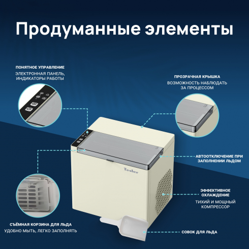 Прозрачная крышка позволяет наблюдать за процессом замораживания. Встроенные индикаторы сигнализируют о необходимости долить воду или освободить корзину от льда. Управление осуществляется через простую и понятную электронную панель.