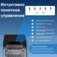 Пользоваться прибором просто: на панели управления расположены удобные кнопки и индикаторы, которые показывают выбранный размер льда, уровень воды и заполненность корзины.