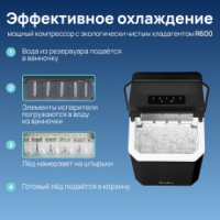 Льдогенератор не требует подключения к водопроводу. Достаточно подключить устройство к сети, добавить воду в резервуар, выбрать размер льда нажатием кнопки, и уже через несколько минут свежий лед будет готов. Льдогенератор автоматически останавливается, когда корзина для льда заполнена. Емкость легко вынимается для удобного использования.