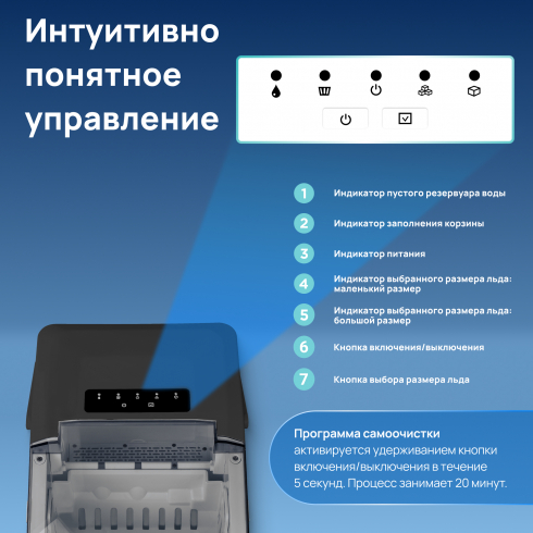 Пользоваться прибором просто: на панели управления расположены удобные кнопки и индикаторы, которые показывают выбранный размер льда, уровень воды и заполненность корзины.