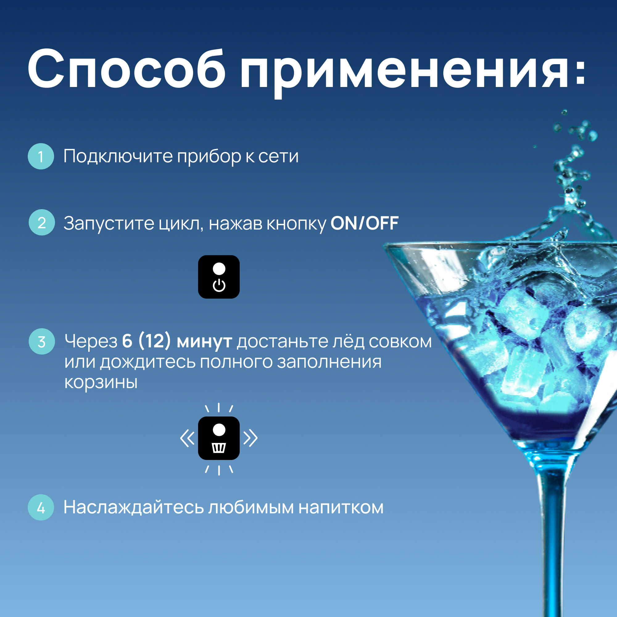 Льдогенератор не требует подключения к водопроводу. Достаточно подключить устройство к сети, добавить воду в резервуар, выбрать размер льда нажатием кнопки, и уже через несколько минут свежий лед будет готов. Льдогенератор автоматически останавливается, когда корзина для льда заполнена. Емкость легко вынимается для удобного использования.
