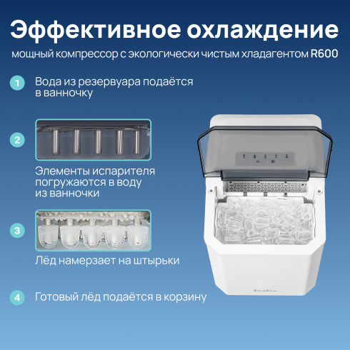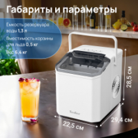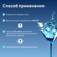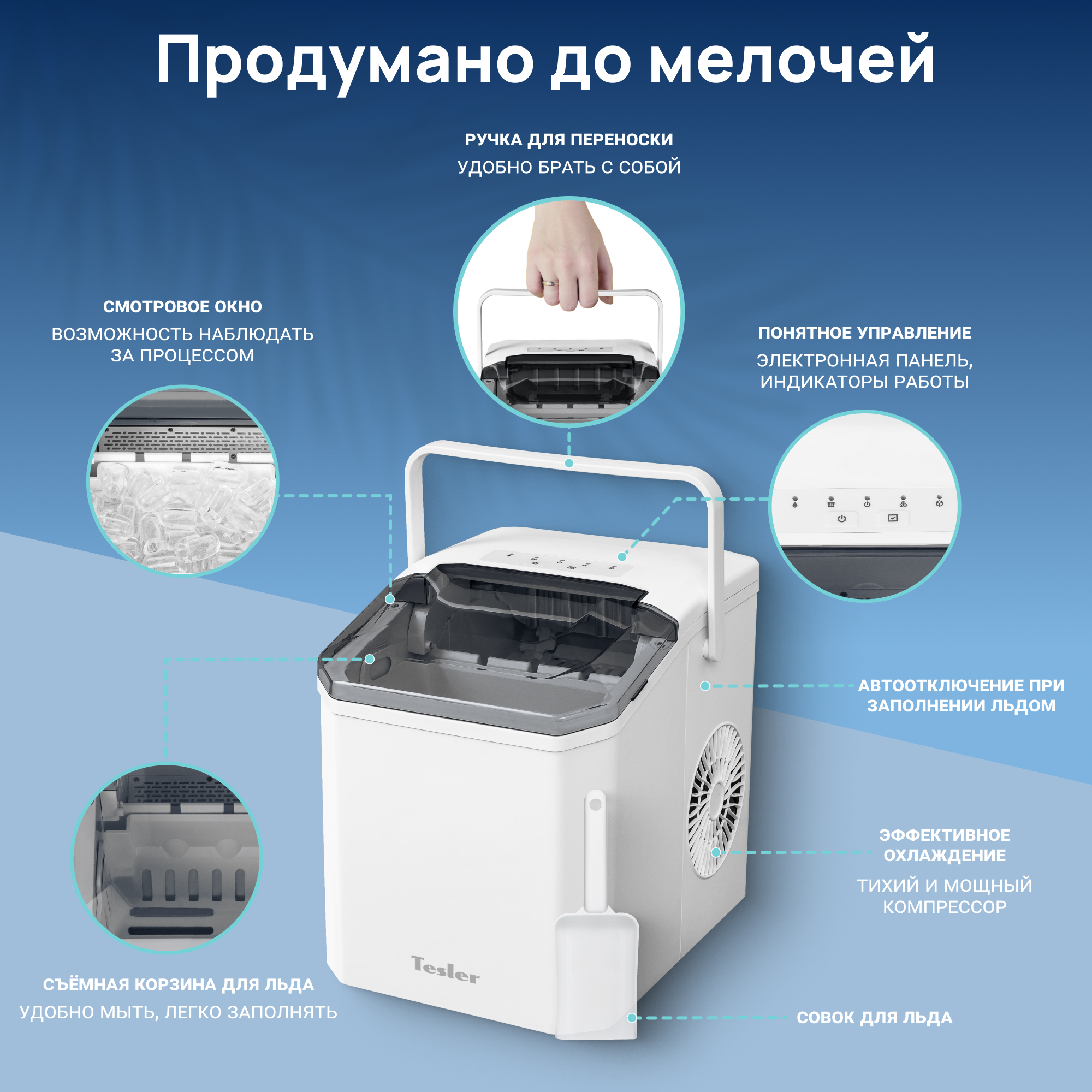 С портативным льдогенератором Tesler ICM-1203 можно быстро приготовить лед для любых целей. В отличие от морозильной камеры холодильника, где заморозка воды занимает несколько часов, это устройство способно приготовить прозрачный пальчиковый лед двух размеров всего за 6-12 минут.