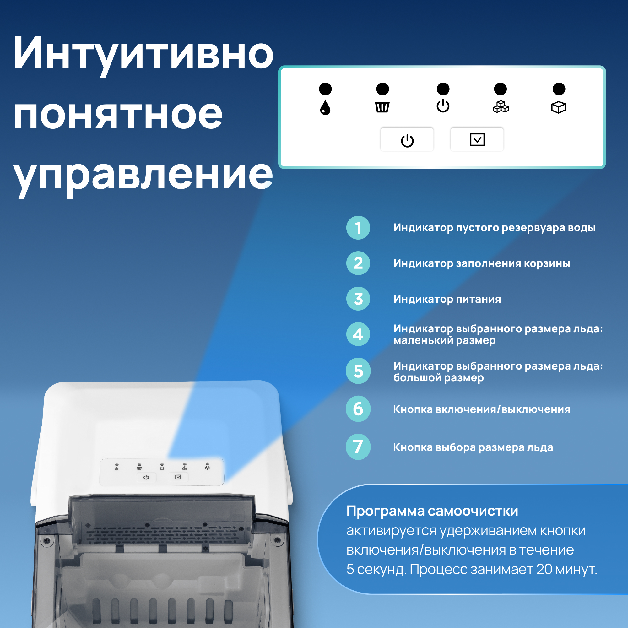 Пользоваться прибором просто: на панели управления расположены удобные кнопки и индикаторы, которые показывают выбранный размер льда, уровень воды и заполненность корзины.