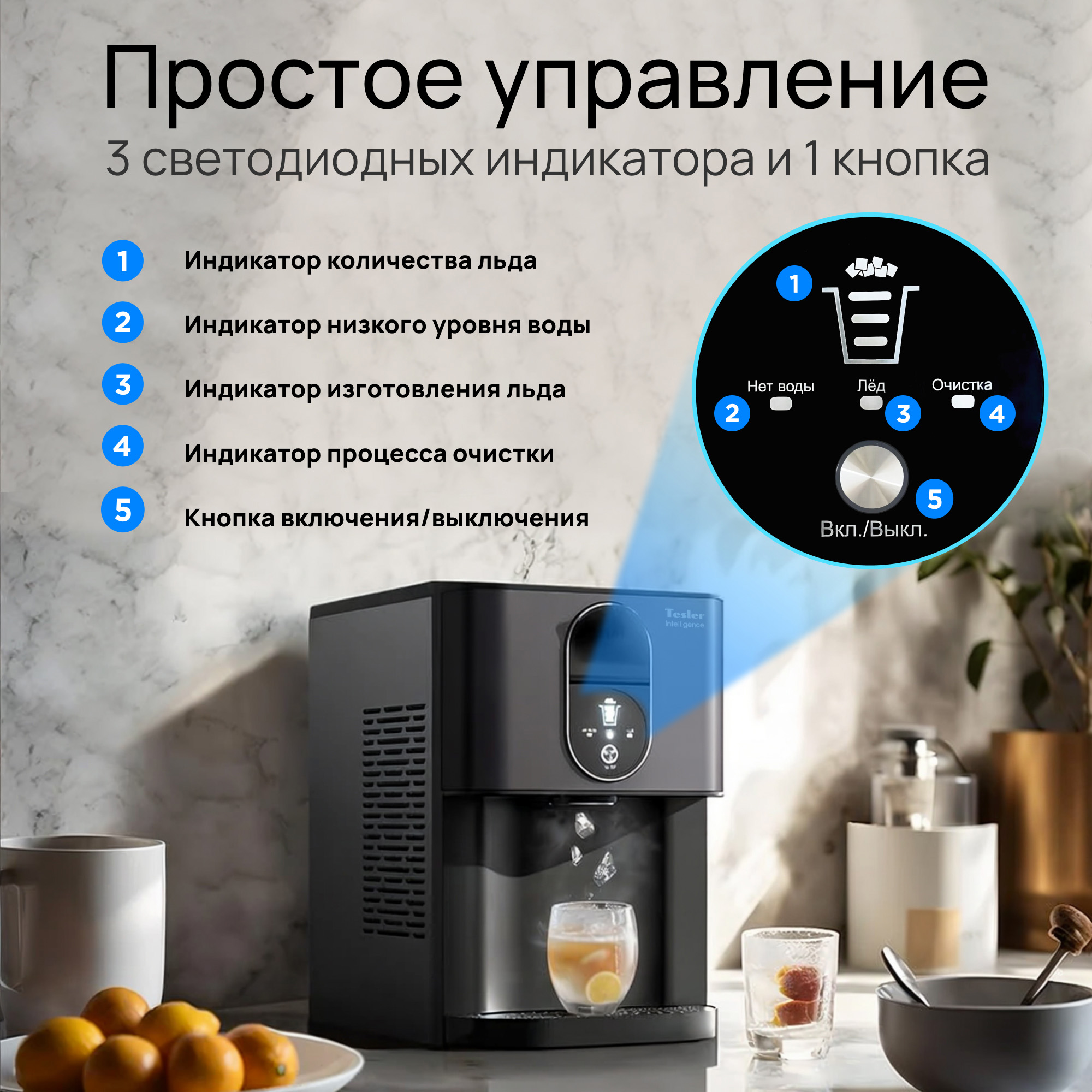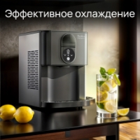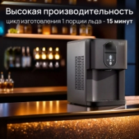 Запуск работы одной кнопкой избавит от необходимости тратить время на то, чтобы вникать в тонкости работы прибора. Удобный LED дисплей предоставит всю необходимую информацию о состоянии устройства, включая уровень заполненности льдом в режиме реального времени. Индикатор нехватки воды напомнит о необходимости наполнить резервуар.