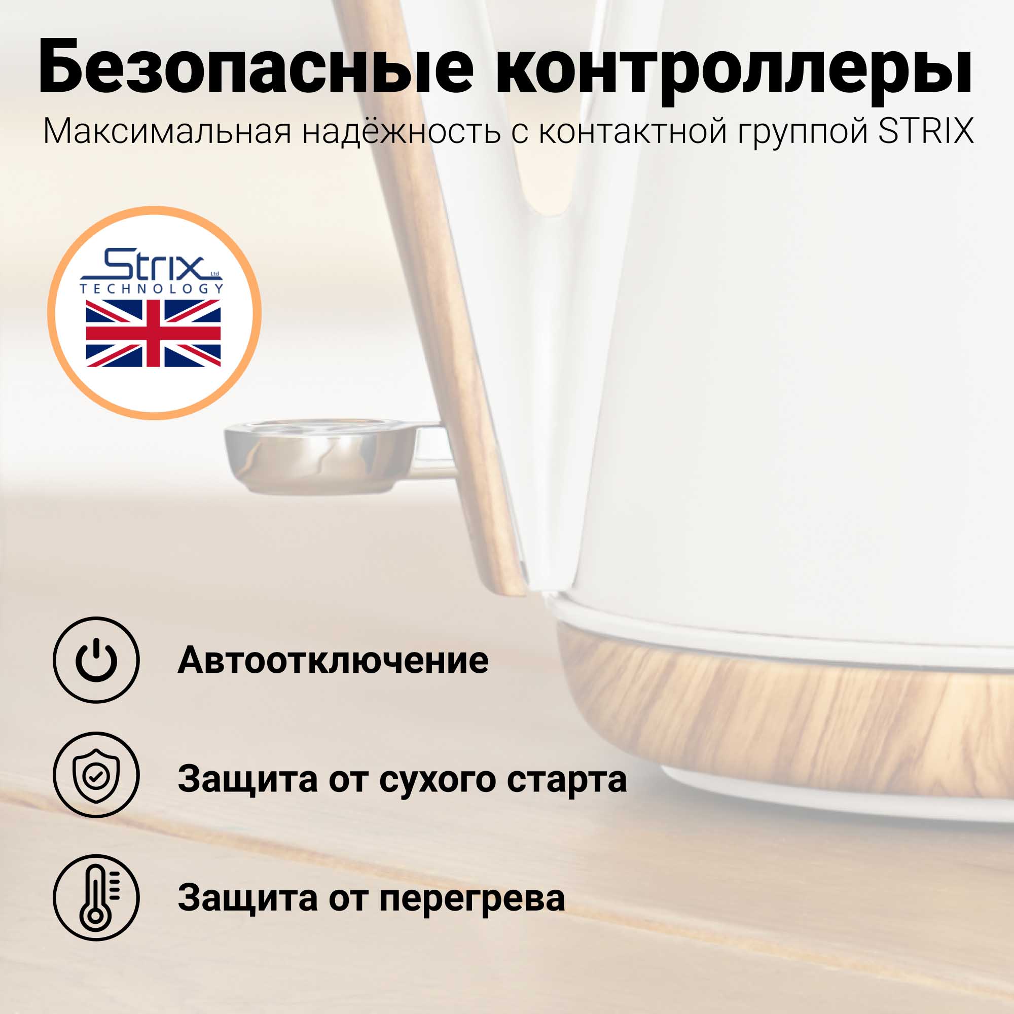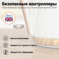 Контактная группа STRIX (Англия) гарантирует полную защиту от проблем, связанных с отсутствием воды при включении чайника. Электроника блокирует попытки "сухого старта", а также отключает чайник при снятии его с рабочей станции.