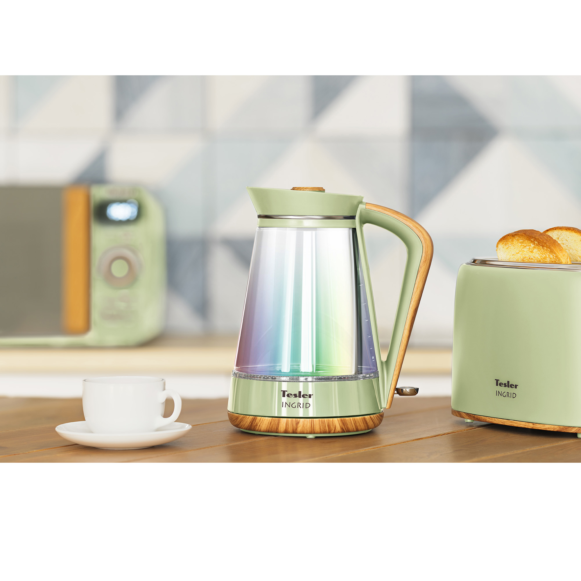 Окружите себя теплом и уютом вместе с линейкой бытовой техники Tesler INGRID. В комплект INGRID входят СВЧ-печь, чайник с корпусом из стекла, чайник из нержавеющей стали, тостер и термопот.