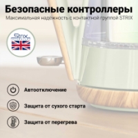 Контактная группа STRIX (Англия) гарантирует защиту от включения при отсутствии воды, а также блокирует попытки "сухого старта", и отключает чайник при снятии его с рабочей станции.