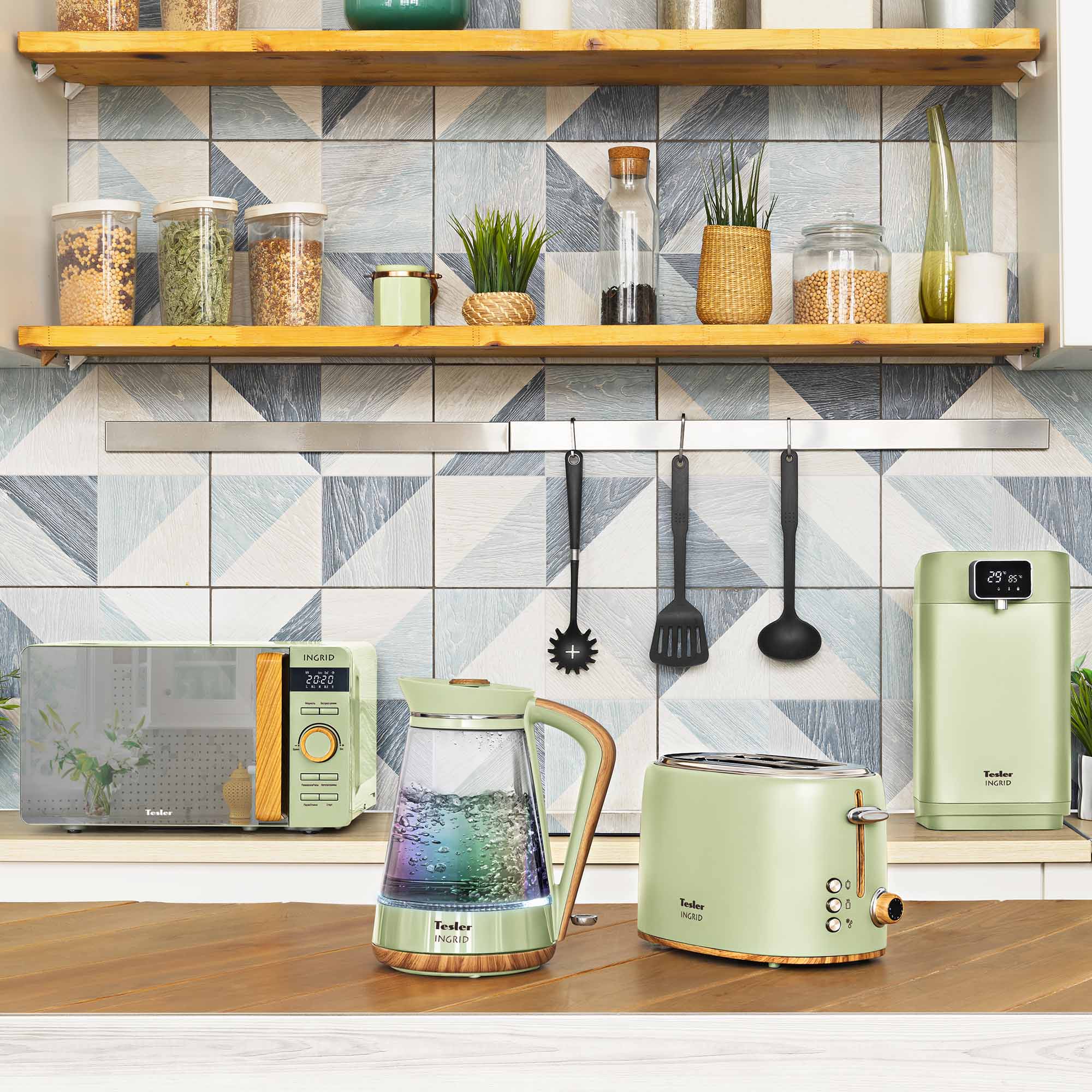 • В комплект кухонной техники Tesler INGRID входят СВЧ-печь, чайник с корпусом из стекла, чайник из нержавеющей стали, тостер и термопот.