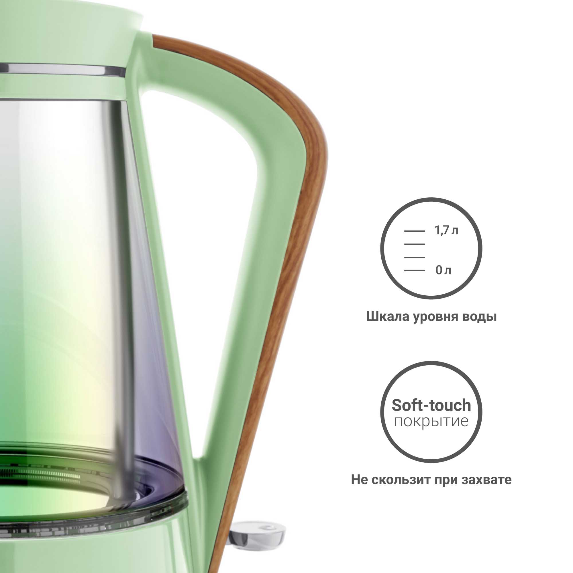 Благодаря декоративным вставкам «под дерево» с приятным на ощупь тактильным покрытием Comfort Touch этот чайник просто создан для того, чтобы стать ярким акцентом на вашей кухне! Подсветка внутри корпуса обрамляет нагревательный диск из нержавеющей стали, и создаёт объём из мягкого света вокруг. Комбинация высококачественных материалов обеспечит удобство использования и долговечность.