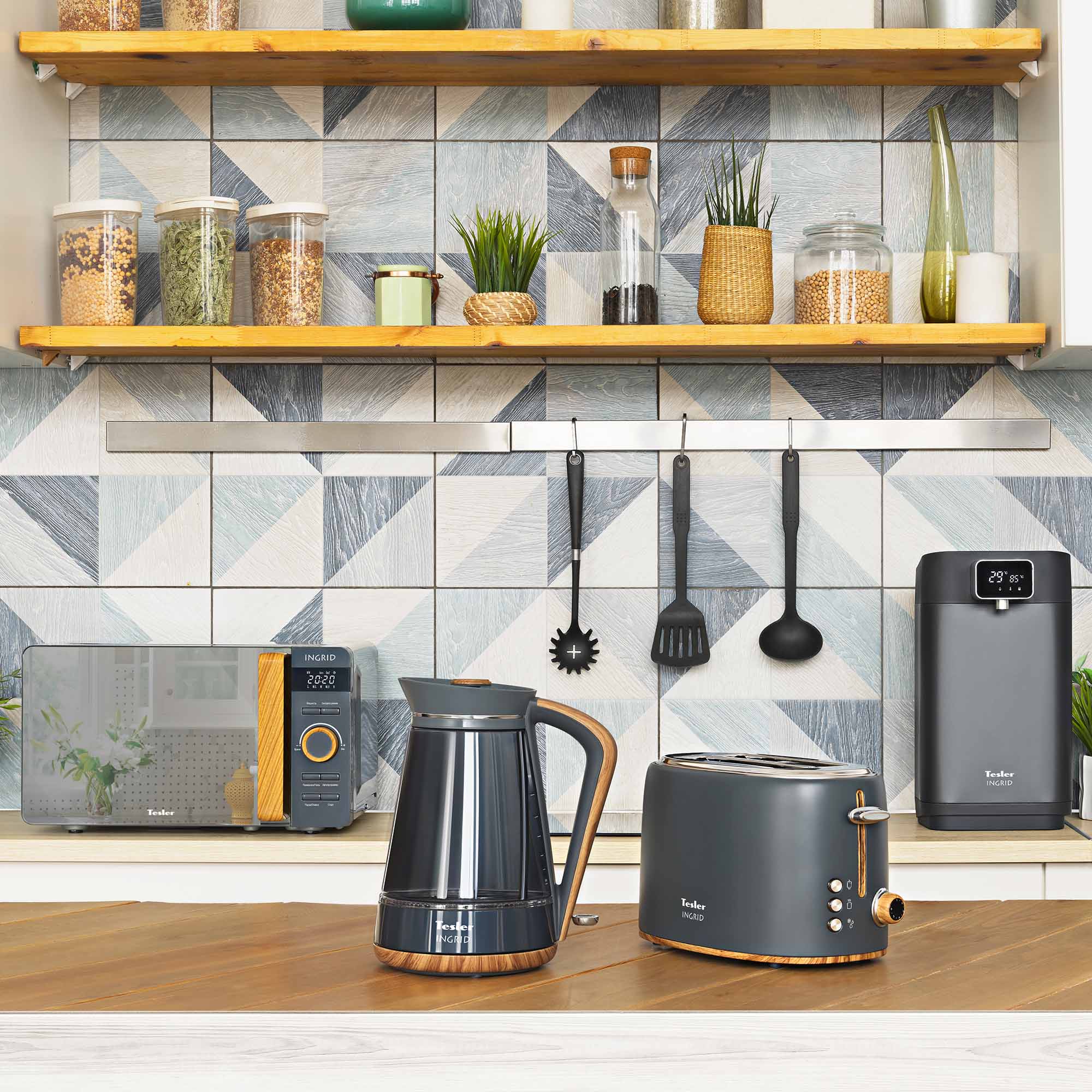 Окружите себя теплом и уютом вместе с линейкой бытовой техники Tesler INGRID. В комплект INGRID входят СВЧ-печь, чайник с корпусом из стекла, чайник из нержавеющей стали, тостер и термопот.