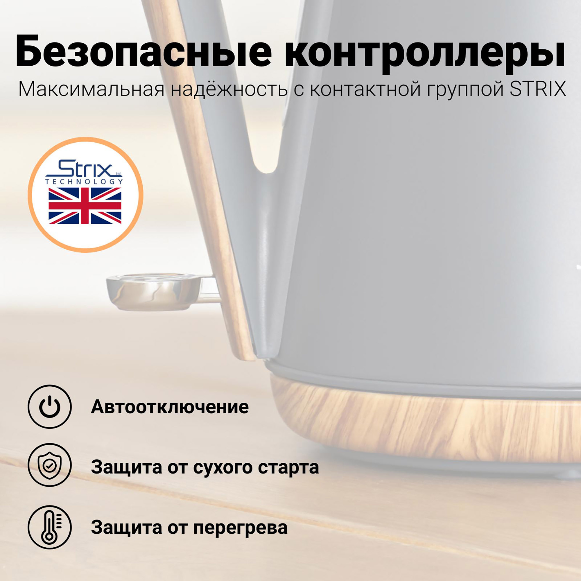 Контактная группа STRIX (Англия) гарантирует защиту от включения при отсутствии воды, а также блокирует попытки "сухого старта", и отключает чайник при снятии его с рабочей станции.