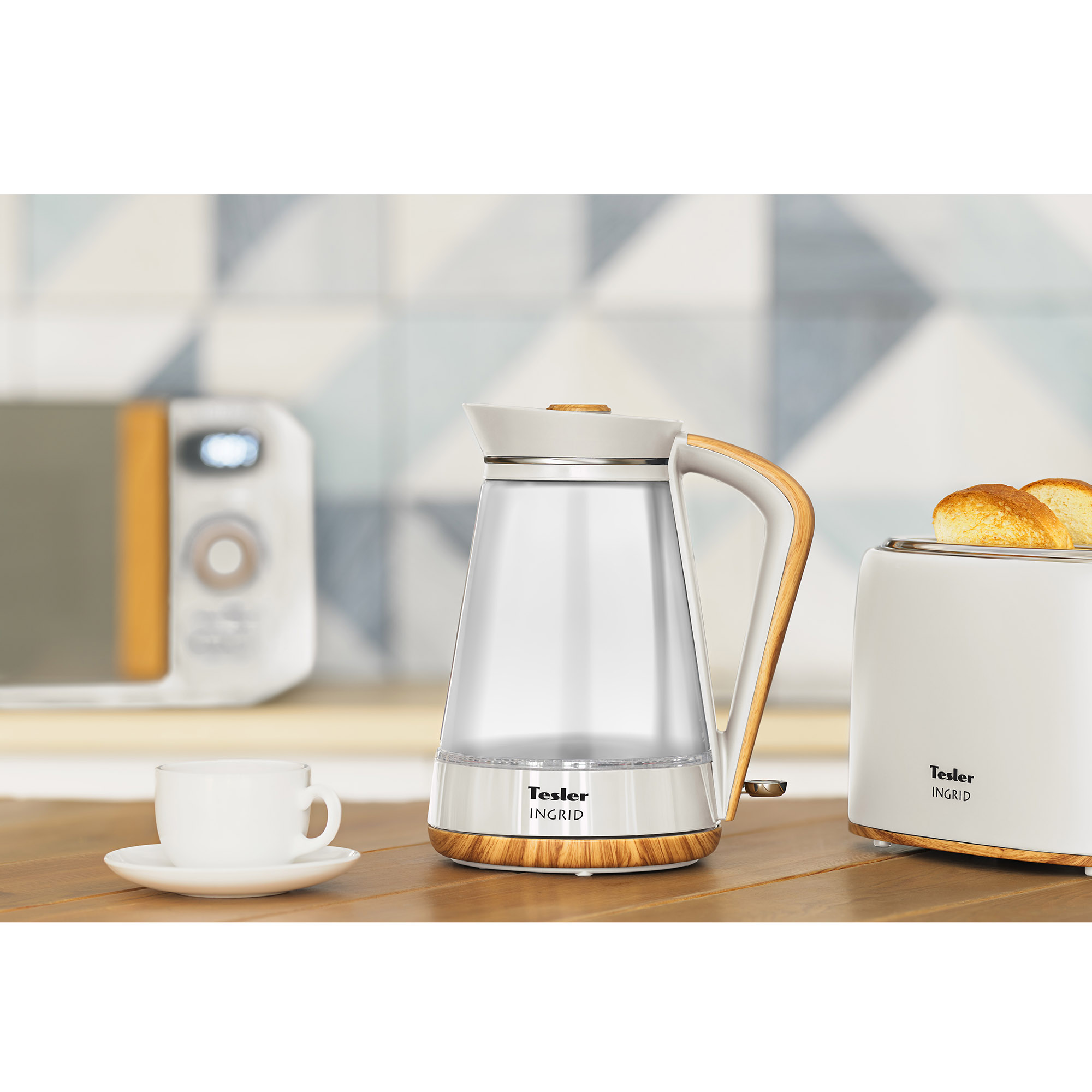 Окружите себя теплом и уютом вместе с линейкой бытовой техники Tesler INGRID. В комплект INGRID входят СВЧ-печь, чайник с корпусом из стекла, чайник из нержавеющей стали, тостер и термопот.