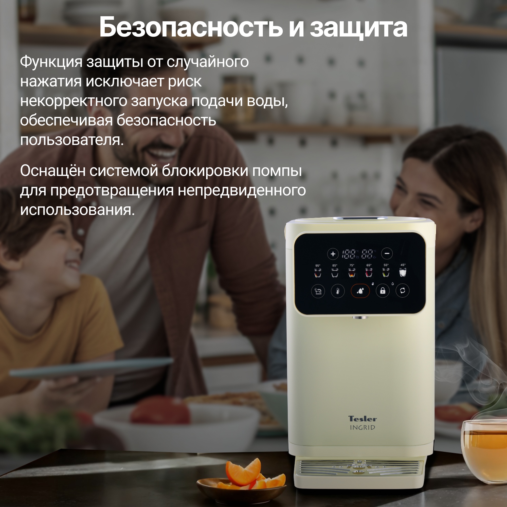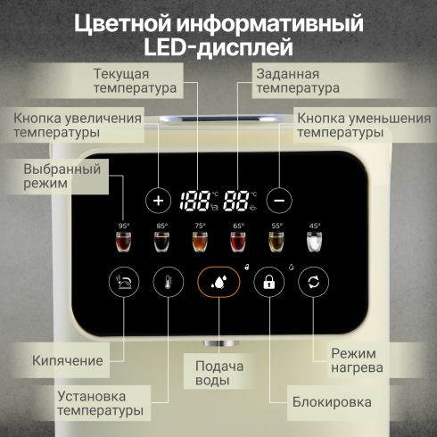 Благодаря точной системе нагрева с возможностью выбора температуры от 35°C до 95°C с шагом в 1ºC, позволяет заваривать напитки с учётом их особенностей, например, зелёный чай или детское питание. Функция автоматического поддержания температуры исключает необходимость повторного кипячения, а сенсорная панель с цветным дисплеем обеспечивает лёгкое и интуитивное управление. Дополнительная безопасность обеспечивается защитой от перегрева при низком уровне воды и блокировкой подачи воды при открытой крышке.