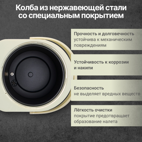 Колба объёмом 5 л. из нержавеющей стали со специальным покрытием уменьшает образование накипи и осадков. Встроенный фильтр грубой очистки воды продлевает срок службы системы подачи воды, предотвращая попадание накипи в воду.