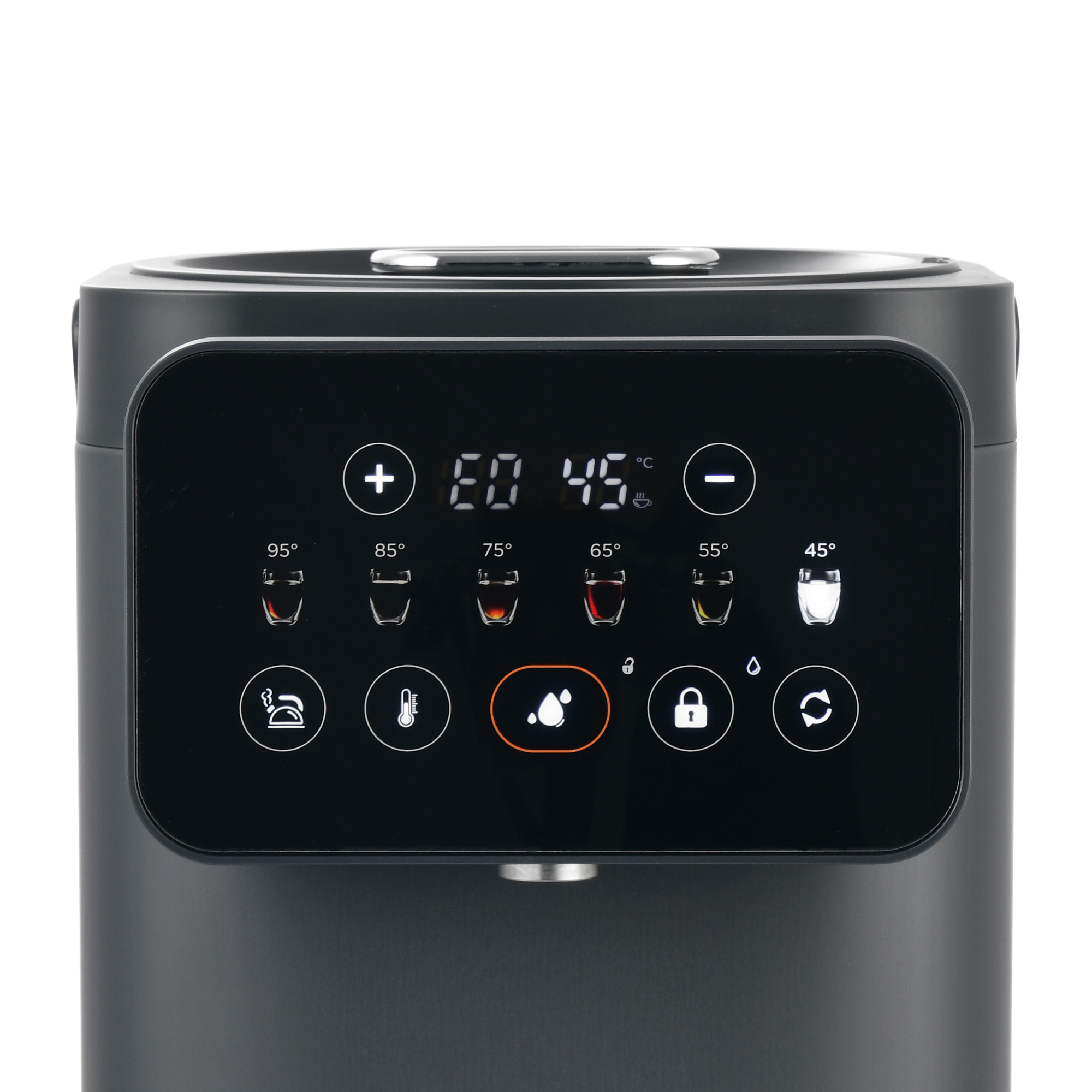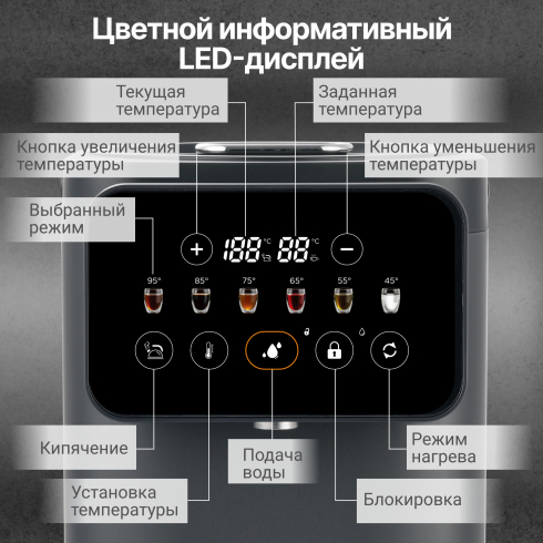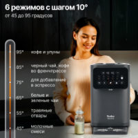 Благодаря точной системе нагрева с возможностью выбора температуры от 35°C до 95°C с шагом в 1ºC, позволяет заваривать напитки с учётом их особенностей, например, зелёный чай или детское питание. Функция автоматического поддержания температуры исключает необходимость повторного кипячения, а сенсорная панель с цветным дисплеем обеспечивает лёгкое и интуитивное управление. Дополнительная безопасность обеспечивается защитой от перегрева при низком уровне воды и блокировкой подачи воды при открытой крышке.