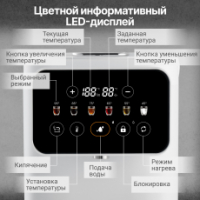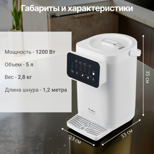 Благодаря точной системе нагрева с возможностью выбора температуры от 35°C до 95°C с шагом в 1ºC, позволяет заваривать напитки с учётом их особенностей, например, зелёный чай или детское питание. Функция автоматического поддержания температуры исключает необходимость повторного кипячения, а сенсорная панель с цветным дисплеем обеспечивает лёгкое и интуитивное управление. Дополнительная безопасность обеспечивается защитой от перегрева при низком уровне воды и блокировкой подачи воды при открытой крышке.