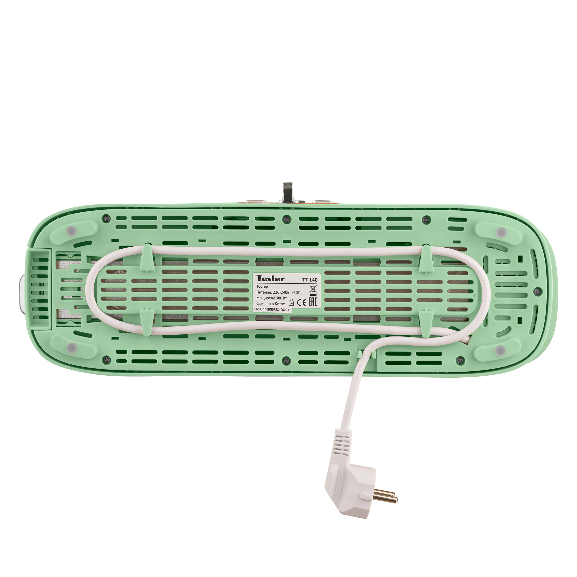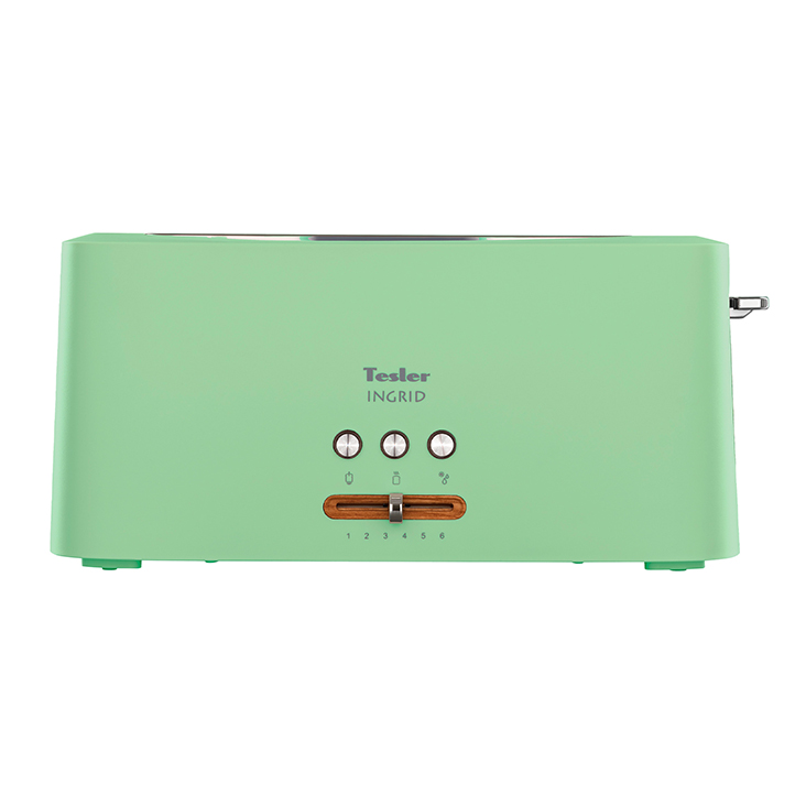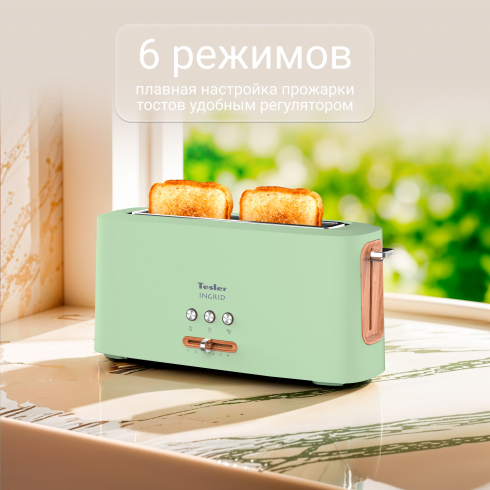 Тостер Tesler TT-140 из линейки кухонных приборов INGRID поможет приготовить равномерно прожаренные со всех сторон тосты. Благодаря своему тонкому корпусу устройство не только экономит место на кухне, но и позволяет одновременно приготовить два тоста рядом друг с другом, или же один длинный ломтик хлеба.