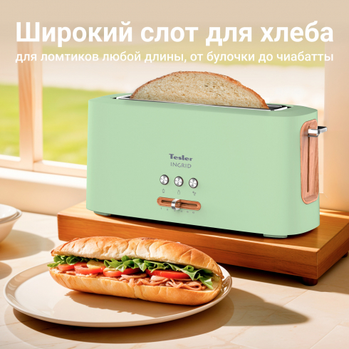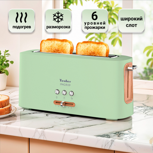 Тостер Tesler TT-140 из линейки кухонных приборов INGRID поможет приготовить равномерно прожаренные со всех сторон тосты. Благодаря своему тонкому корпусу устройство не только экономит место на кухне, но и позволяет одновременно приготовить два тоста рядом друг с другом, или же один длинный ломтик хлеба.