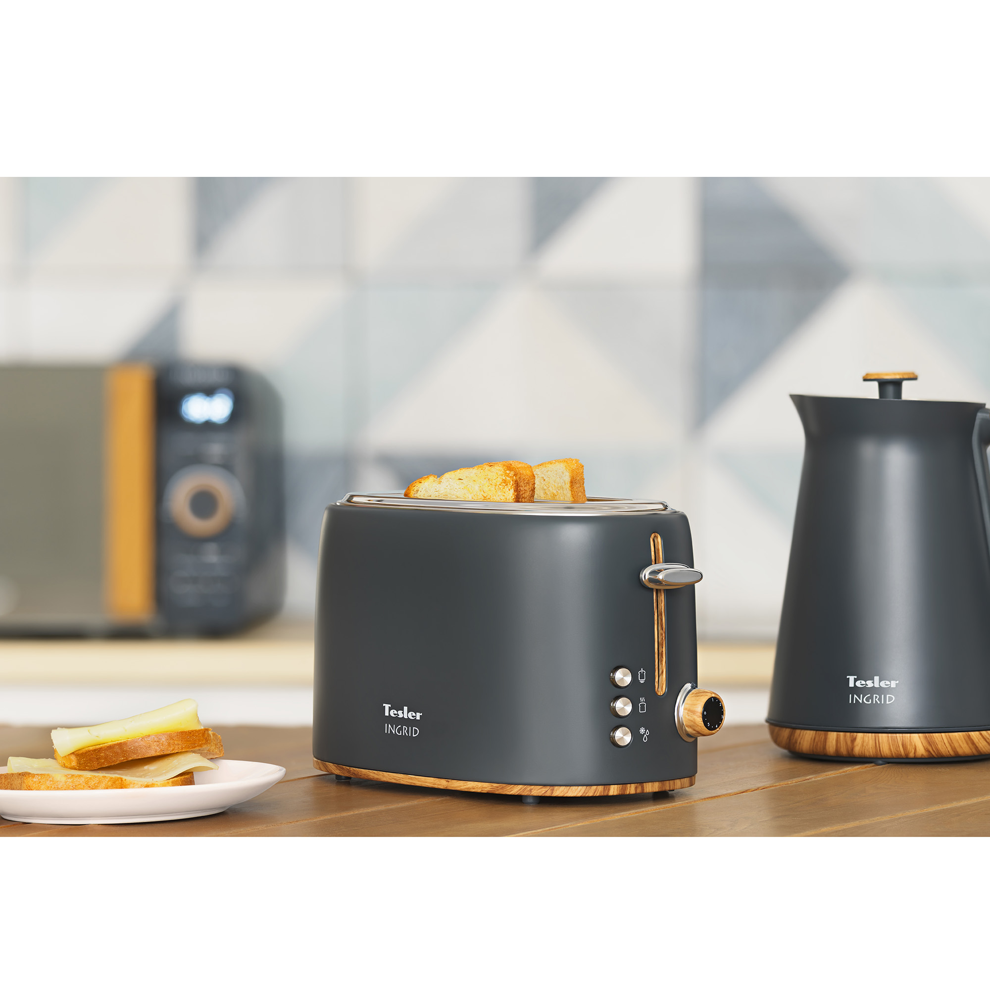 В комплект кухонной техники Tesler INGRID входят 4 устройства: СВЧ-печь, чайник, тостер и термопот.