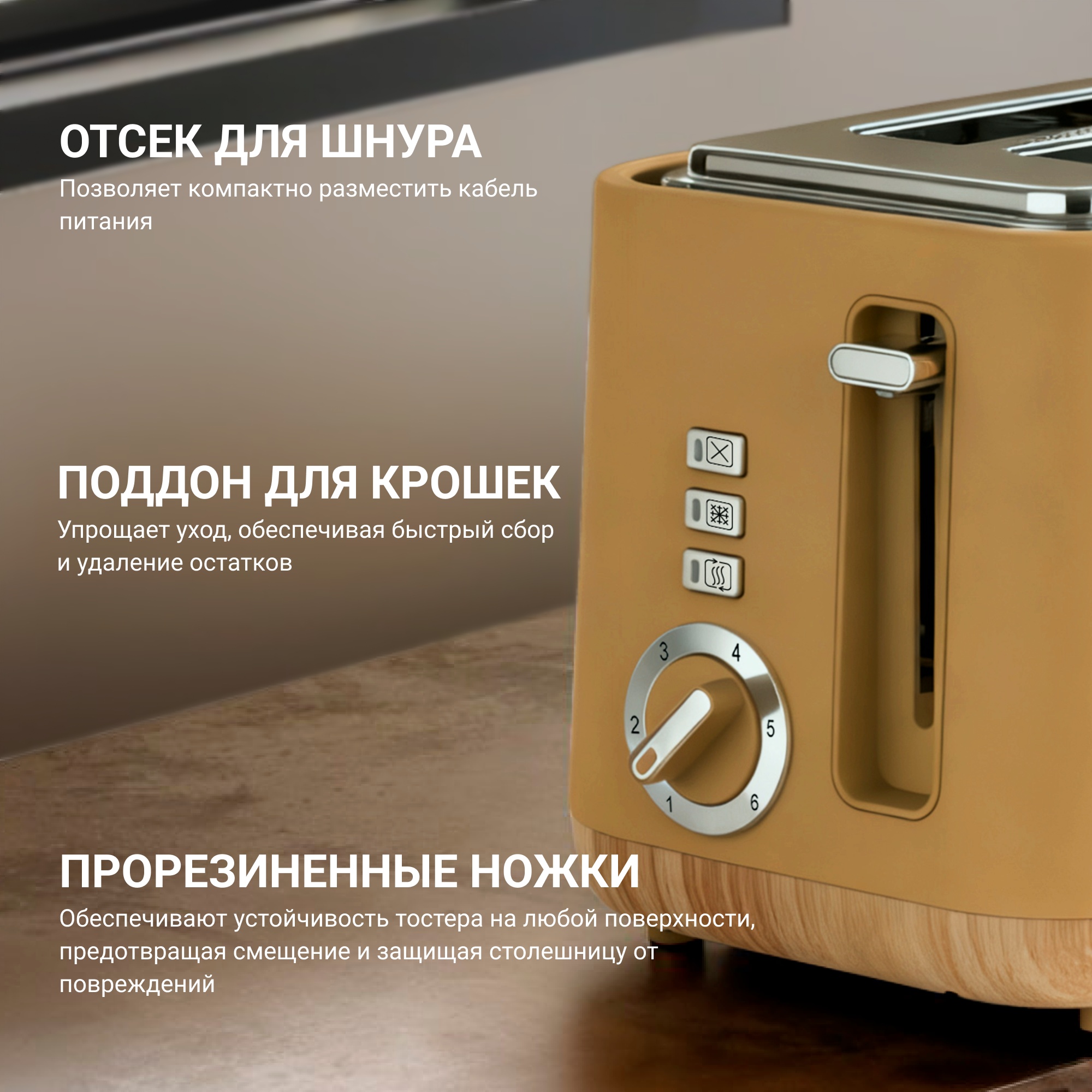 Практичный съемный поддон для крошек упрощает уход за устройством. Прорезиненные ножки позволяют установить тостер практически на любой поверхности и защищают столешницу от царапин и потёртостей. Отсек для шнура позволяет компактно разместить кабель питания.