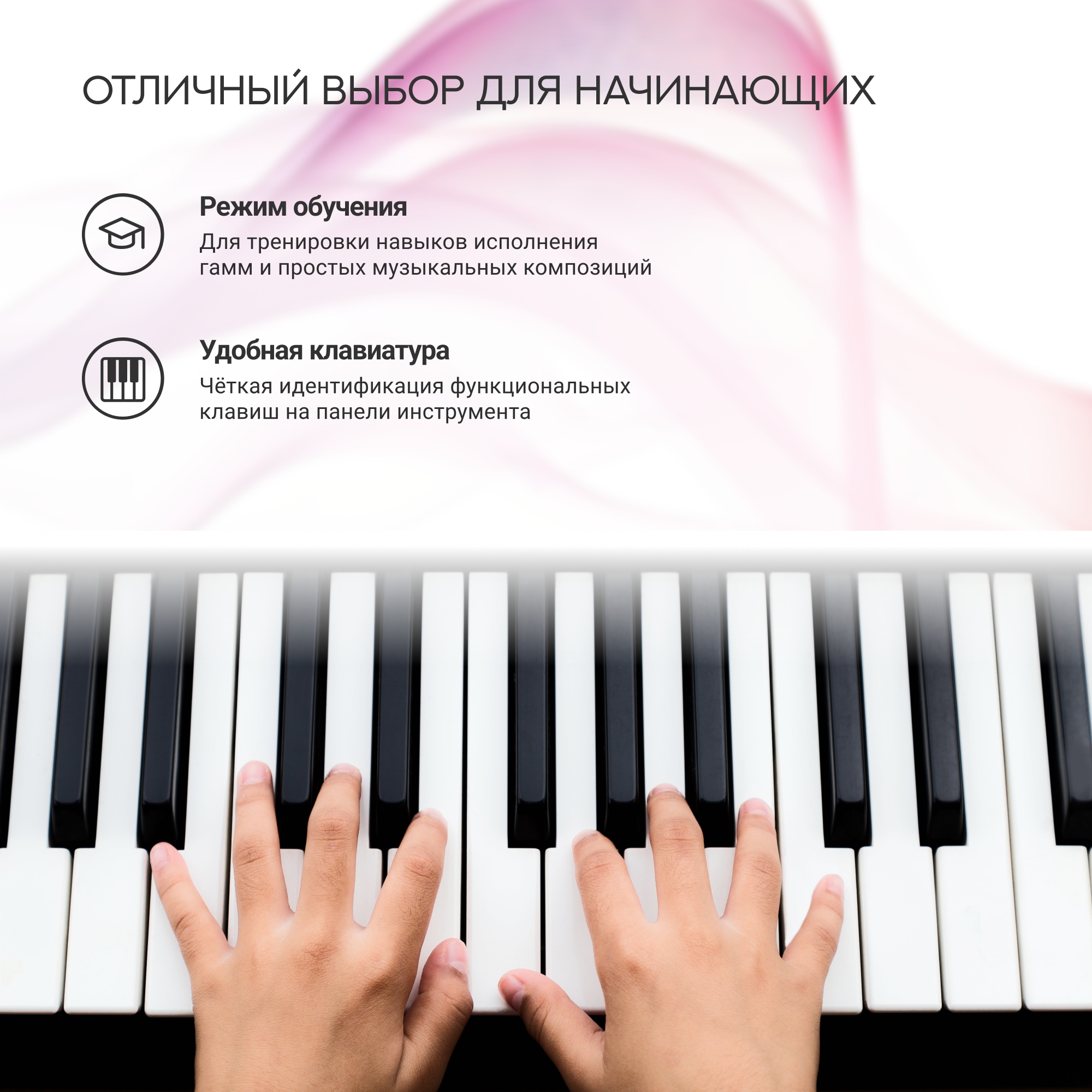 Обучающие программы «Соло», «Следование» и «Ансамбль» помогут начинающим в освоении игры на синтезаторе, позволяя тренировать слух и чувство ритма. Суть упражнений состоит в том, чтобы "набить руку": воспроизводится мелодия, аккомпанируемая нотами, которые проигрывает пользователь. Оттачивайте навыки, играя вместе с демо-песнями.