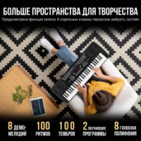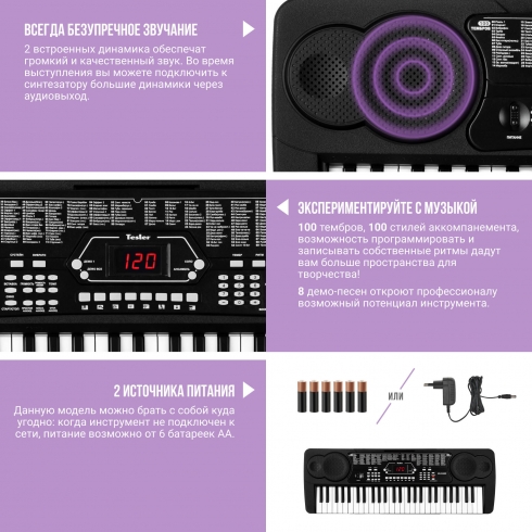 Портативный клавишный инструмент начального уровня Tesler KB-5420 с широким разнообразием тембров и ритмов, с возможностью записи произведений подойдет для начинающих музыкантов. Данный синтезатор может работать как от внешнего источника питания, так и от батарей питания. Вы можете создавать, записывать и проигрывать вашу собственную музыку. В устройстве предусмотрена встроенная система воспроизведения звука. Также вы можете подключить внешние стереосистемы или усилители через соответствующий разъем.