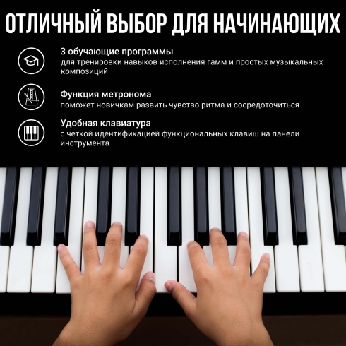 • Настраиваемый метроном, функция автоаккомпанемента, 3 режима обучения и 21 демо мелодия делают данную модель идеальной для начального уровня.
