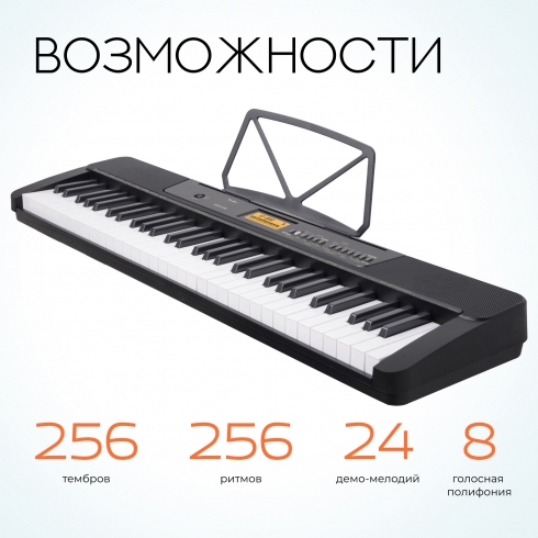 качественное звучание, 61 клавиша, 256 тембров и столько же ритмов;