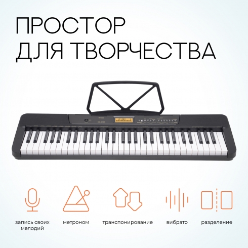Возможности модели помогут раскрыть творческие способности: предусмотрены режим разделения клавиатуры, режим сустейна, вибрато, транспонирование. Настраиваемый метроном поможет научиться держать заданный темп.