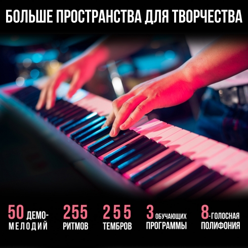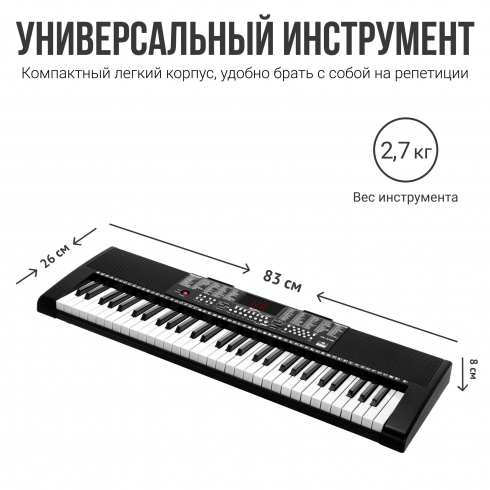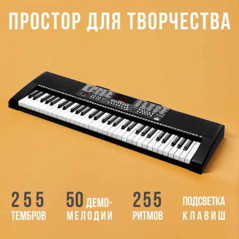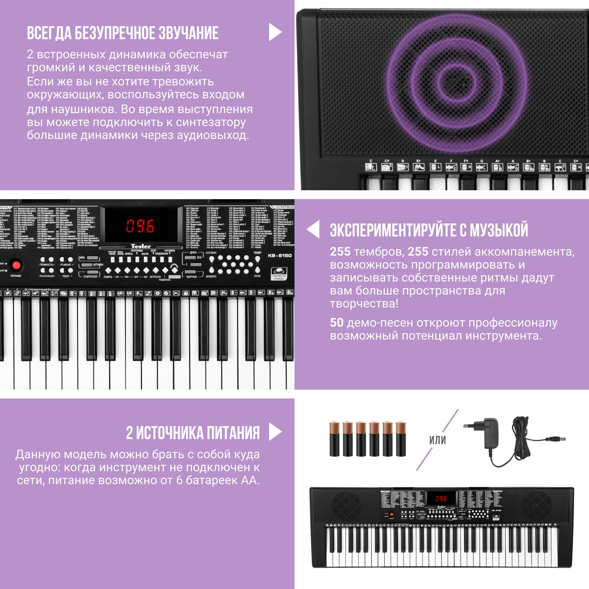 Электронный синтезатор Tesler KB-6150 предлагает широкий функционал, включая режим обучения с подсветкой клавиш, являясь при этом доступной моделью. Инструмент может похвастаться следующими характеристиками: 255 ритмов, 255 тембров, 50 демо-мелодий + возможность использования синтезатора в качестве аудиосистемы.