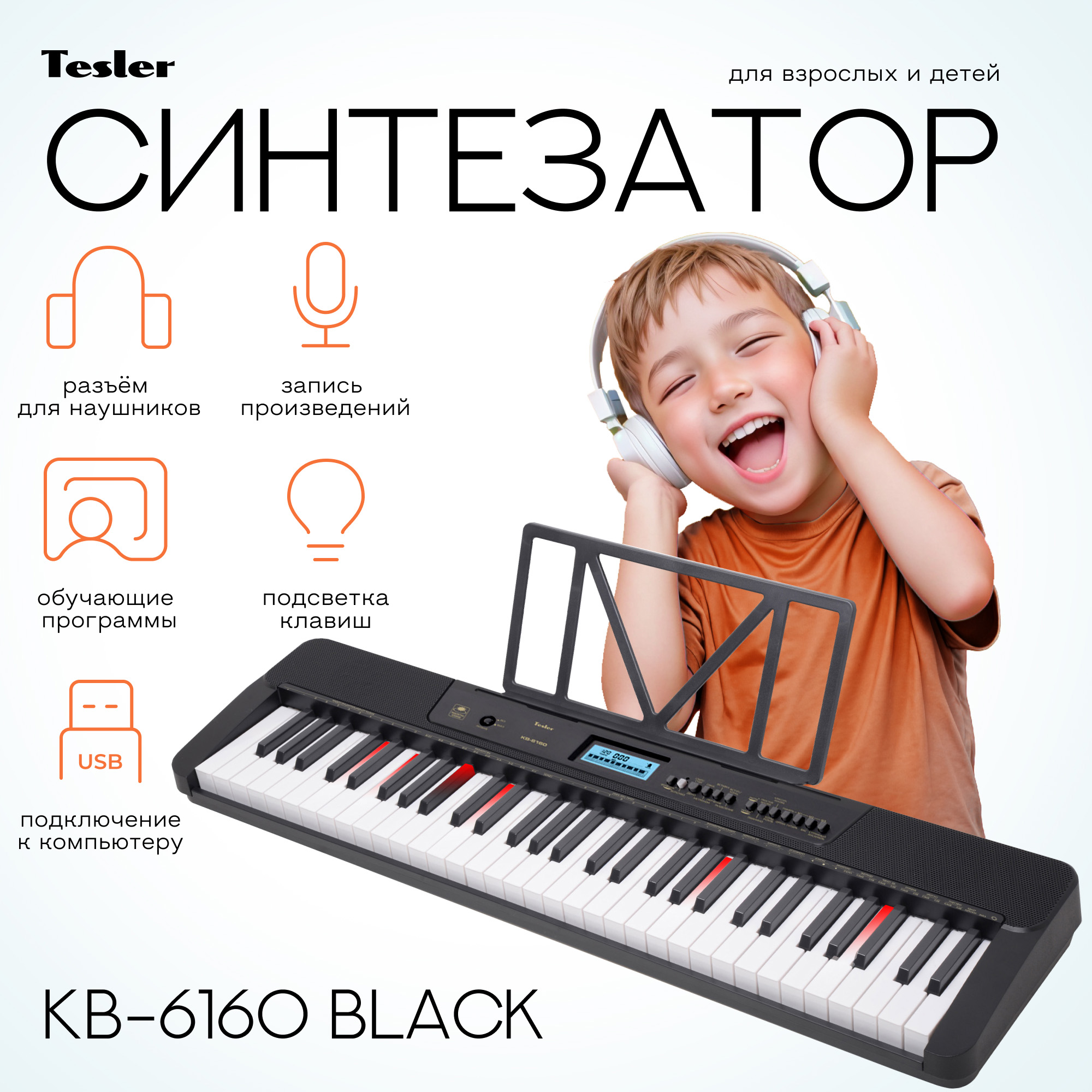 Электронный синтезатор Tesler KB-6160 - это доступный музыкальный инструмент, который отлично подойдет как новичкам, так и тем, кто уже умеет играть на клавишных. Удобный интерфейс инструмента упростит обучение игре: к вашим услугам дисплей для отображения нот и аккордов, разъёмы для подключения различных полезных гаджетов, а еще клавиши с подсветкой, с которыми можно начать играть, даже не зная нот.