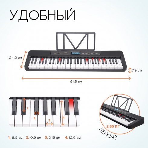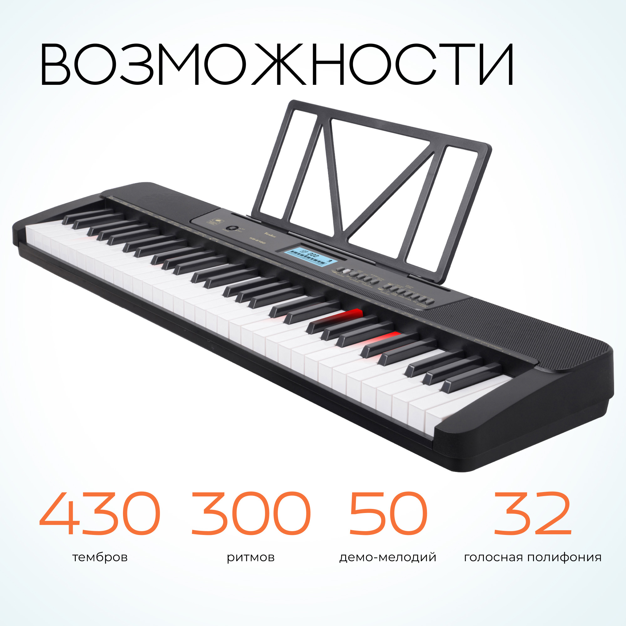 качественное звучание, 61 клавиша с подсветкой, 430 тембров, 300 ритмов;