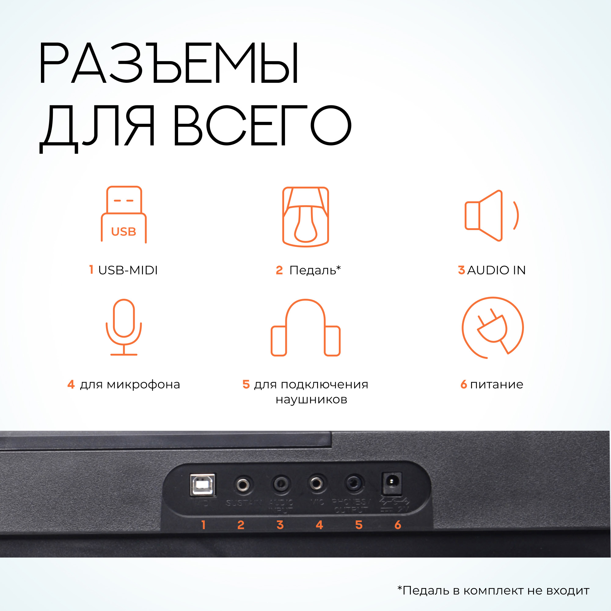 Инструмент оборудован портом для подключения педали сустейн (педаль приобретается отдельно). Сустейн позволит достичь большей выразительности при исполнении, и сходства с акустическим фортепиано.