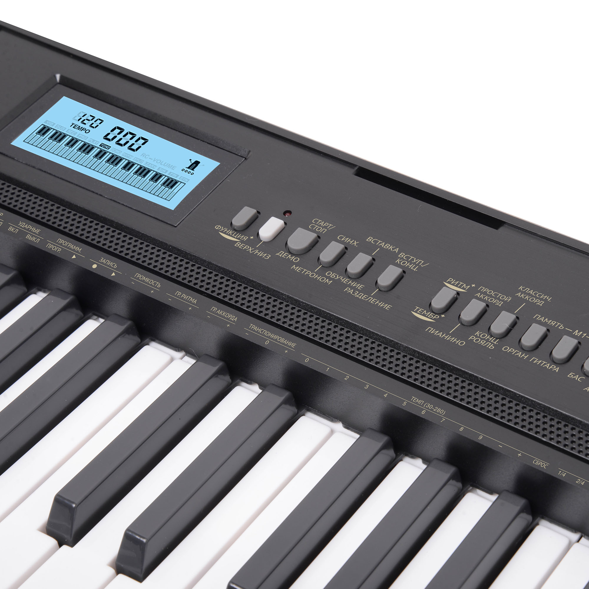 Настраиваемый метроном поможет научиться держать заданный темп. Предусмотрены функции чувствительности и сустейна, режим разделения клавиатуры, транспонирование, вибрато. Устройство имеет четкую рускоязычную идентификацию функциональных клавиш, ритмов и тембров на панели инструмента - вы легко включите нужный параметр одним нажатием кнопки.