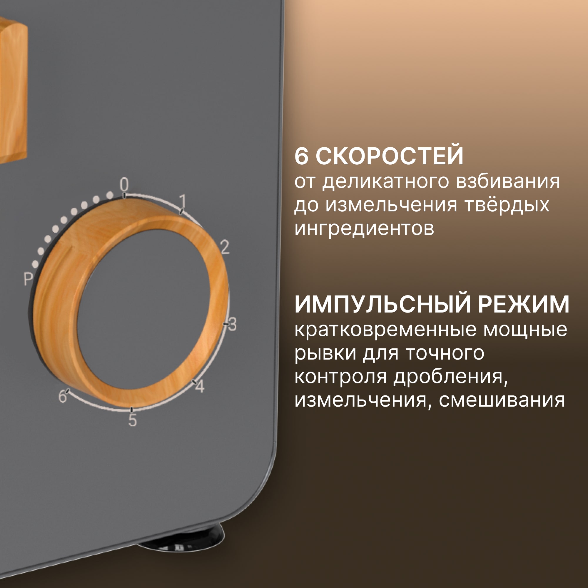 Блендер оснащён отдельной чашей из закалённого стекла объёмом 1,5 литра с острыми ножами из нержавеющей стали. Он легко справляется с льдом, орехами и твёрдыми овощами. Доступны шесть скоростей и импульсный режим для точного контроля консистенции смузи, соусов и детского питания. Максимальная скорость — 18 000 об/мин. Крышка оснащена отверстием для добавления ингредиентов во время работы.