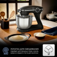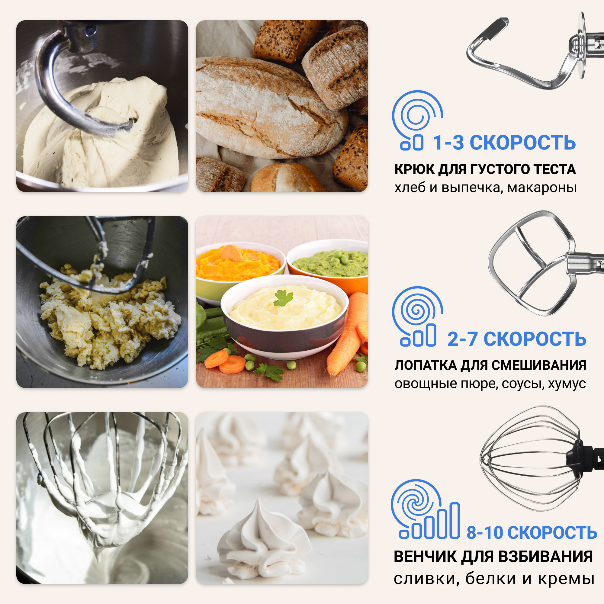С помощью идущих комплекте аксессуаров вы сможете быстро и эффективно соединять различные ингредиенты. Крюк для замешивания предназначен для приготовления густого теста для пирогов, хлеба и другой выпечки. Насадка для перемешивания подойдёт для смесей средней вязкости, таких как овощные пюре и соусы. Венчик будет полезен для взбивания яиц, сливок, кремов, чтобы придать им воздушность и объем. Конструкция планетарного миксера позволяет взбить венчиком даже 1 яйцо, чтобы приготовить небольшую порцию. Все насадки изготовлены из прочной нержавеющей стали.